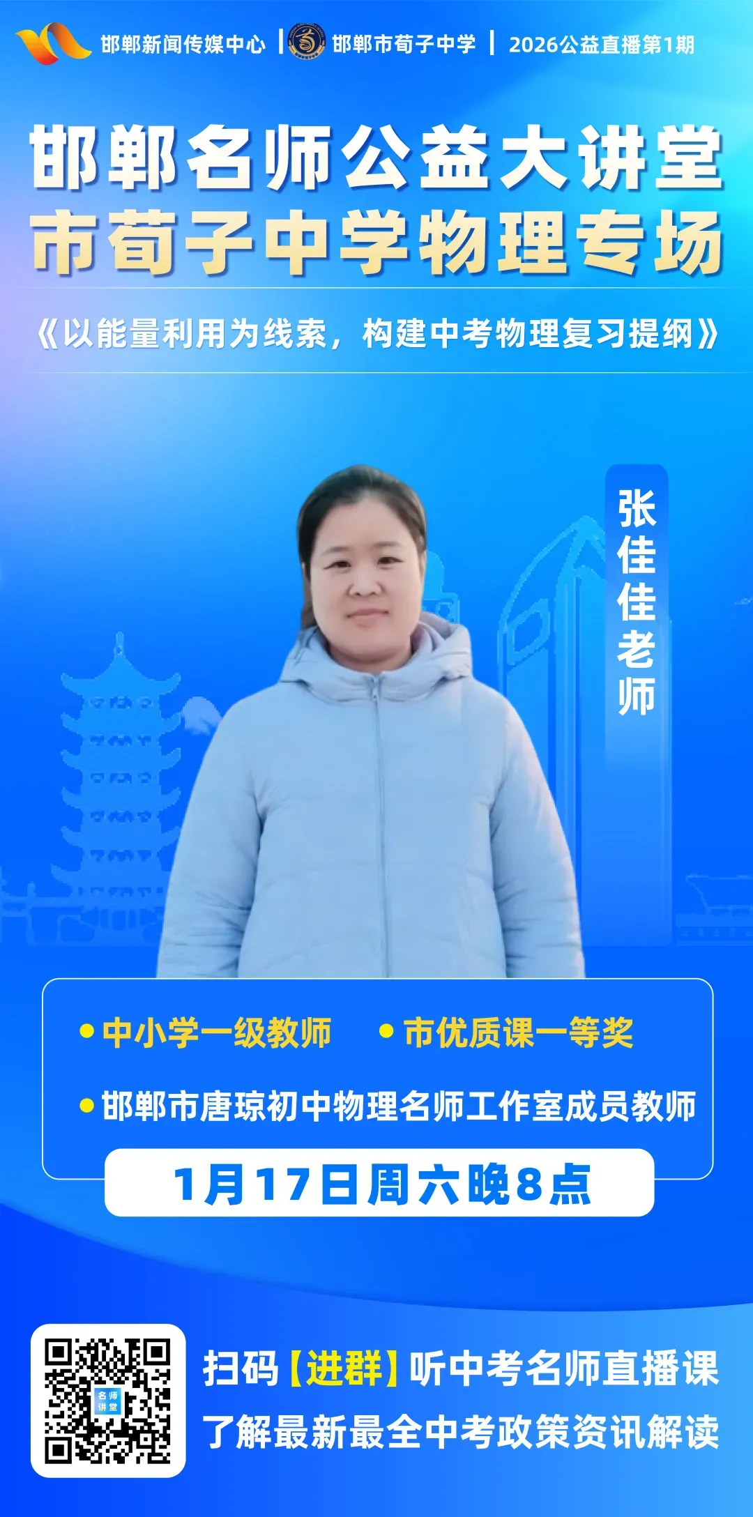 “邯郸名师公益大讲堂”首期直播定于1月17日周六晚8点,特邀邯郸市荀子中学开启专场直播。届时,中小学一级教师、市优质课一等奖获得者、邯郸市唐琼初中物理名师工作室成员教师、邯郸市荀子中学张佳佳老师讲授《以能量利用为线索,构建中考物理复习提纲》,助力学生掌握好物理学习的重难点。欢迎全市广大初三学生扫码进群收看。