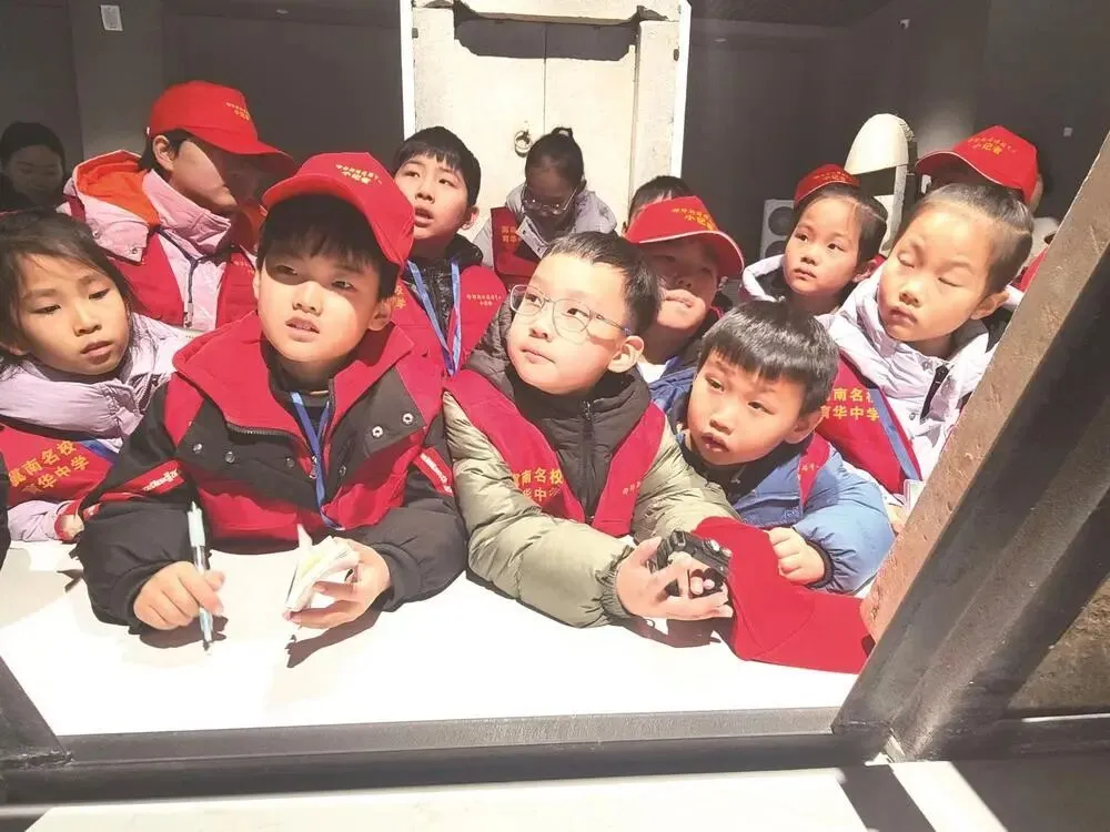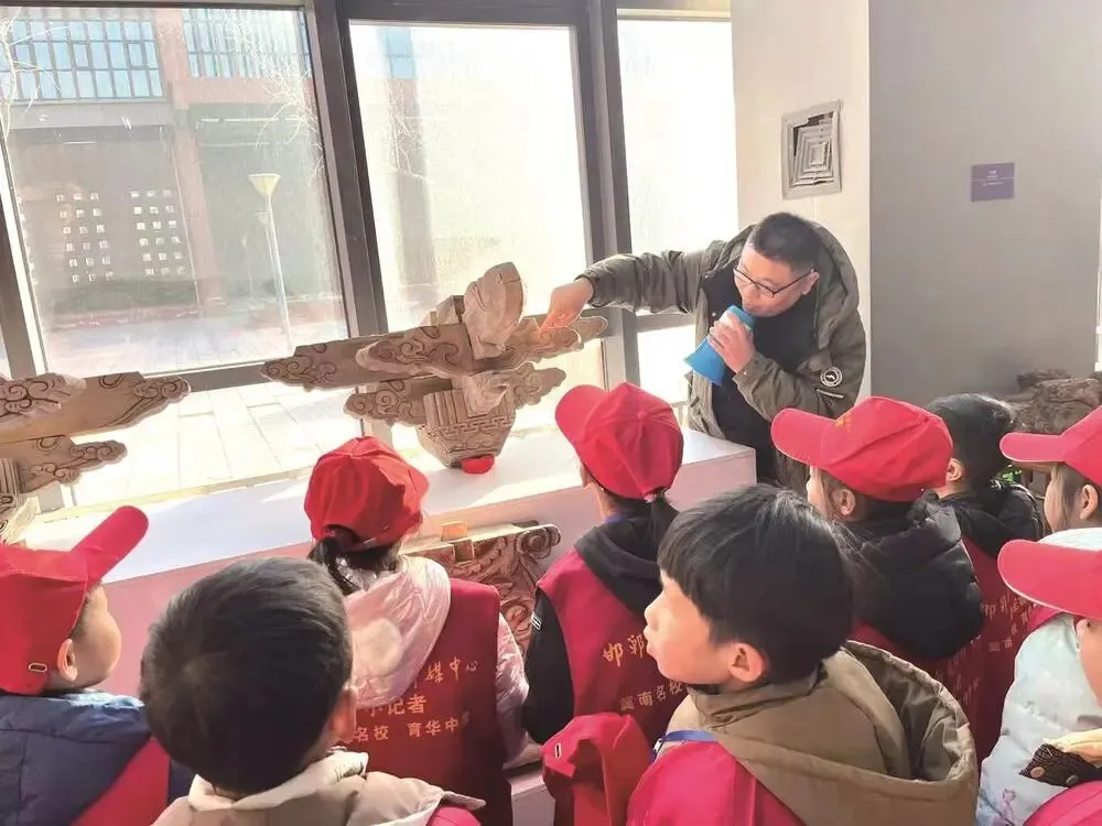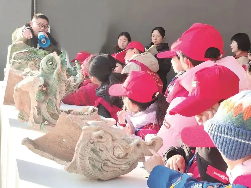 在螭吻陈列区,王老师讲解道:“在古建筑屋脊两端,常能看到威风凛凛的神兽——螭吻。传说它是古神话中龙生九子之一,龙头鱼身,能吞火降水,因此被安放在殿角屋脊,既具装饰作用,也寄托着人们防火避灾的美好愿望。”小记者们仔细观察着展台上的几件宋代琉璃螭吻,被王老师渊博的知识、生动的讲解深深吸引,不时提出问题,现场互动踊跃。