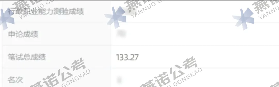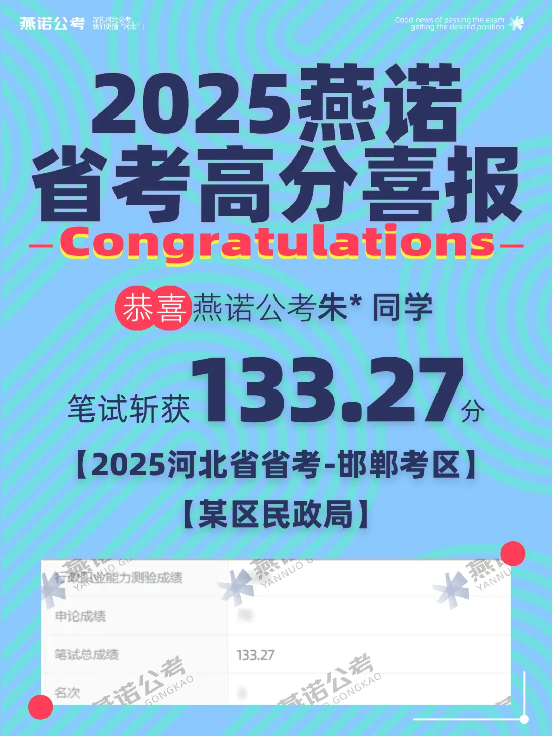 恭喜燕诺学员朱*同学,以133.27分的笔试成绩成功进面河北省考-某区民政局!