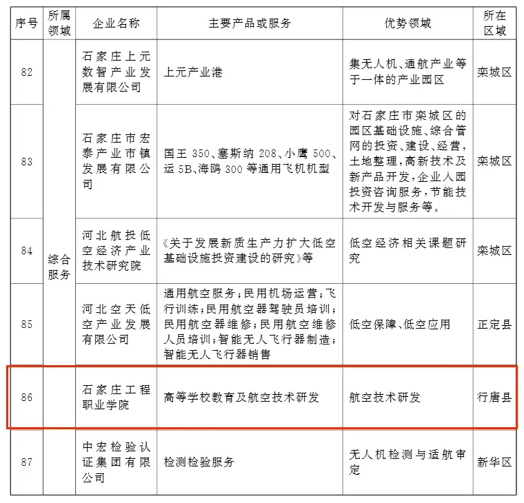 石家庄市低空经济工业企业及优势产品分布表(节选)