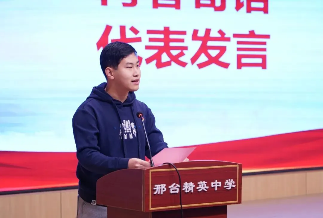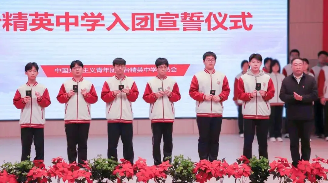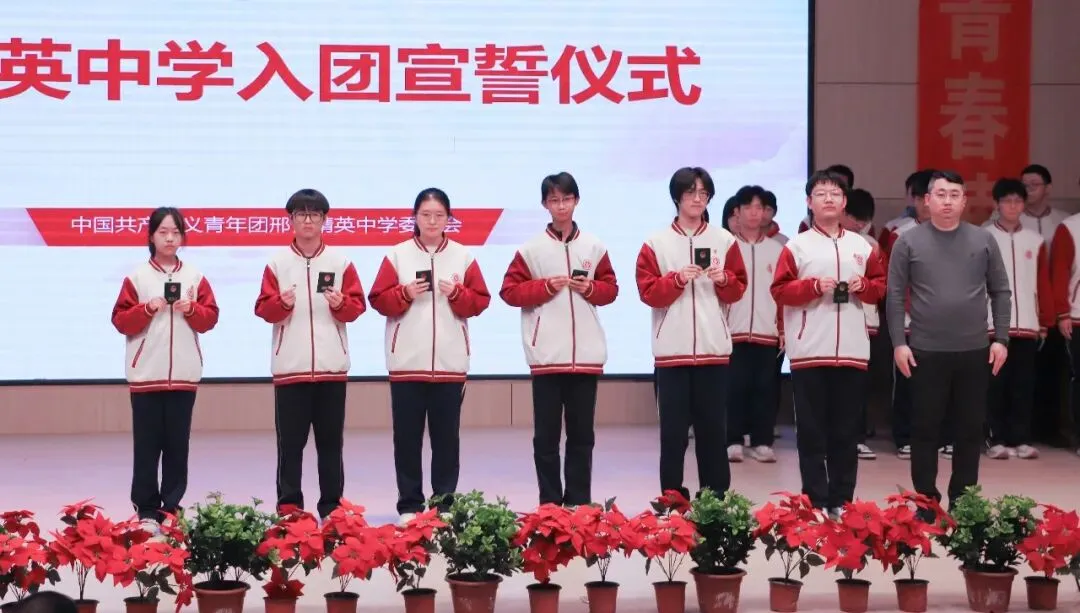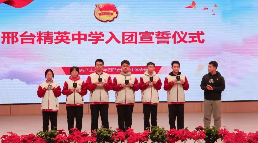 石家庄精英中学邢台校区副校长王玉媚宣读新入团成员名单,在全场响起的热烈掌声中,参会领导与毕业生代表为新团员代表颁发团员证并佩戴团员徽章。崭新的团徽在胸前闪耀,标志着他们正式开启共青团员的崭新征程。