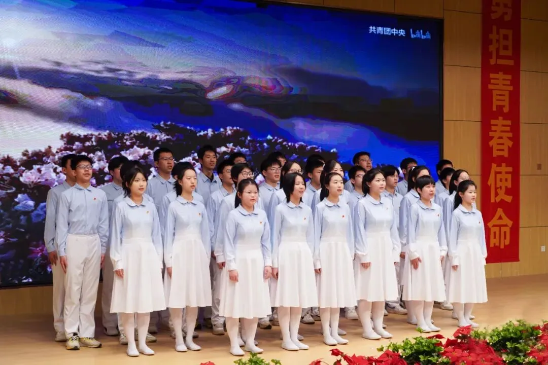 “一个有希望的民族不能没有英雄,一个有前途的国家不能没有先锋”,新团员以情景朗诵《我宣誓》讴歌英雄人物先进事迹,激励大家牢记使命、奋勇向前;大合唱《光荣啊,中国共青团》以嘹亮歌声将仪式推向高潮,这是对共青团的礼赞,更是青春力量的凝聚,星星之火,燃烧在每一位团员的心中。