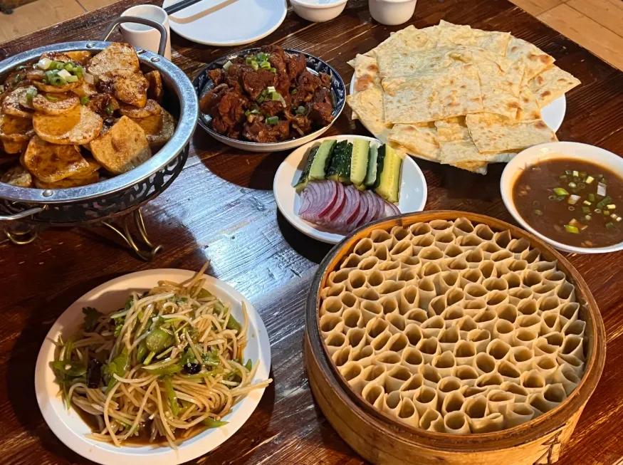 莜面窝窝、莜面鱼鱼、山药蛋,听名字就土气,吃起来是真香。这里不讲究摆盘,讲究实惠。还有烤羊腿,外皮焦黄,肉汁锁在里面,撕着吃才过瘾。