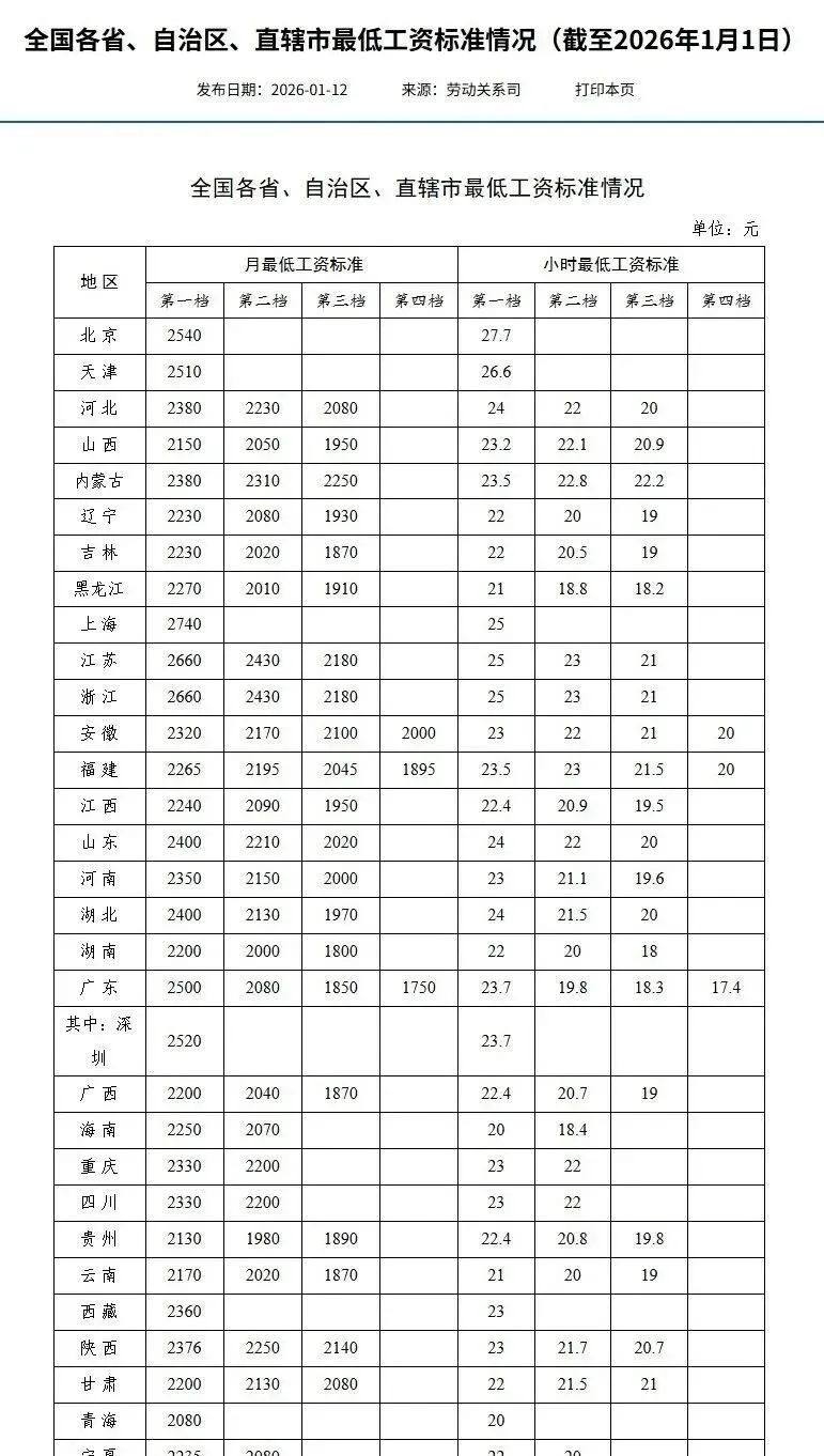 人力资源和社会保障部官网公布全国各省、自治区、直辖市最低工资标准情况其中