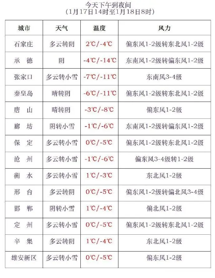 河北省气象台2026年01月17日11时发布天气预报