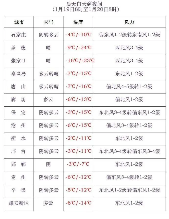 明天夜间到19日,保定中西部、石家庄中西部、邢台、邯郸阴有小雪或零星小雪转多云,其他地区阴转多云。