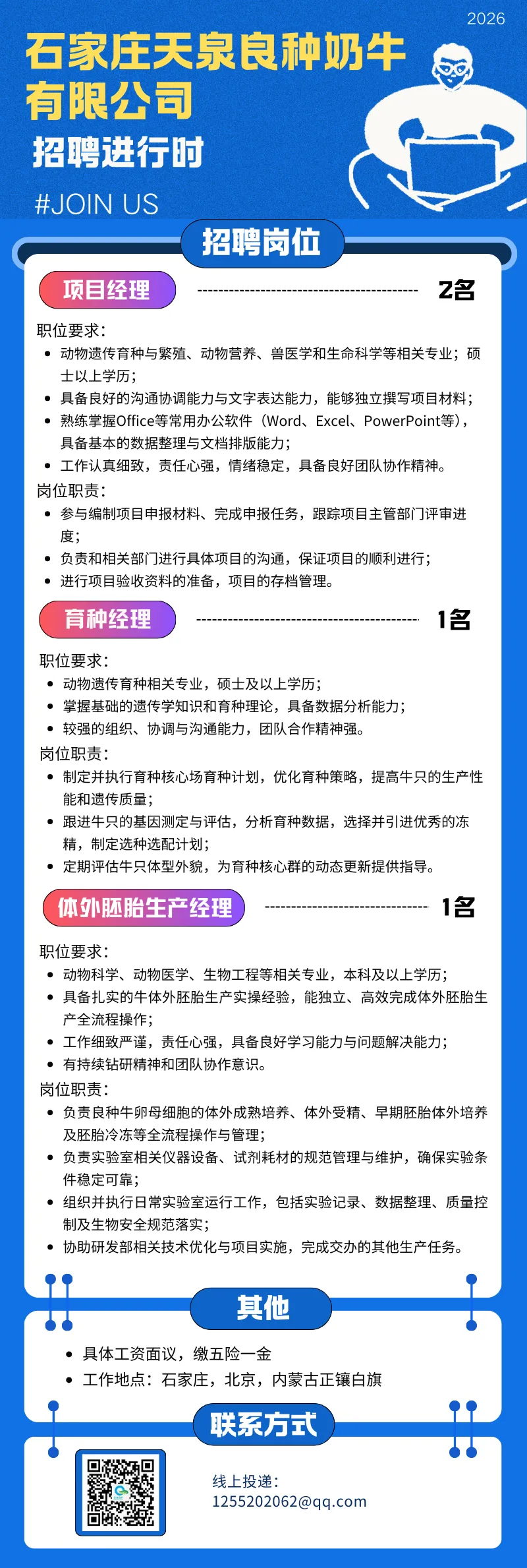 2、应届毕业生如学业成绩优异,有扎实的实习或项目经验,对牧场工作有强烈热情者也可考虑 。