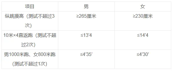 以上体能测试项目中,三项均合格视为体能测试合格。体能测试通过的人员,在报名网站公布名单,自行查询打印《笔试准考证》。