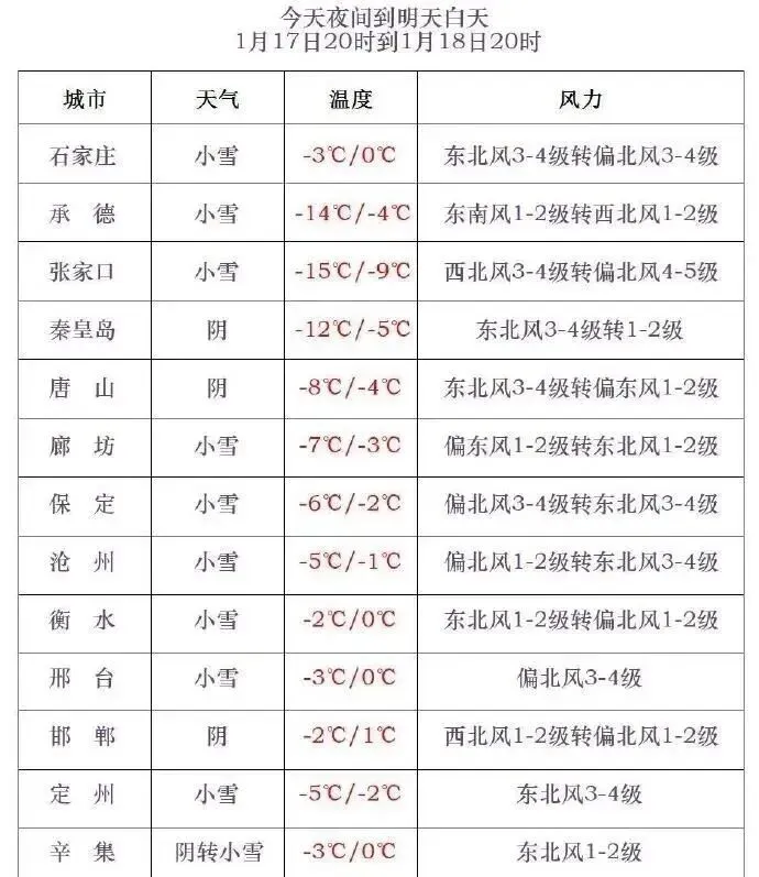 1 月 17 日石家庄降雪于上午 10 时左右率先在平山县出现零星小雪,主城区及西部山区 13-15 时陆续飘雪。