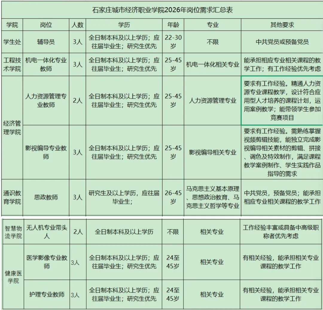 石家庄城市经济职业学院2026年公开招聘22名工作人员公告