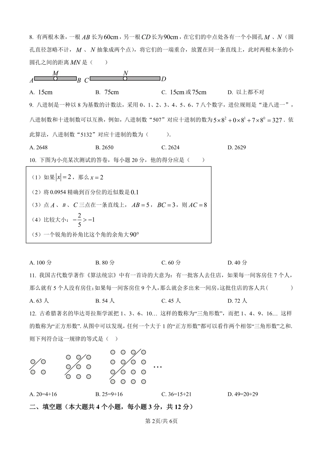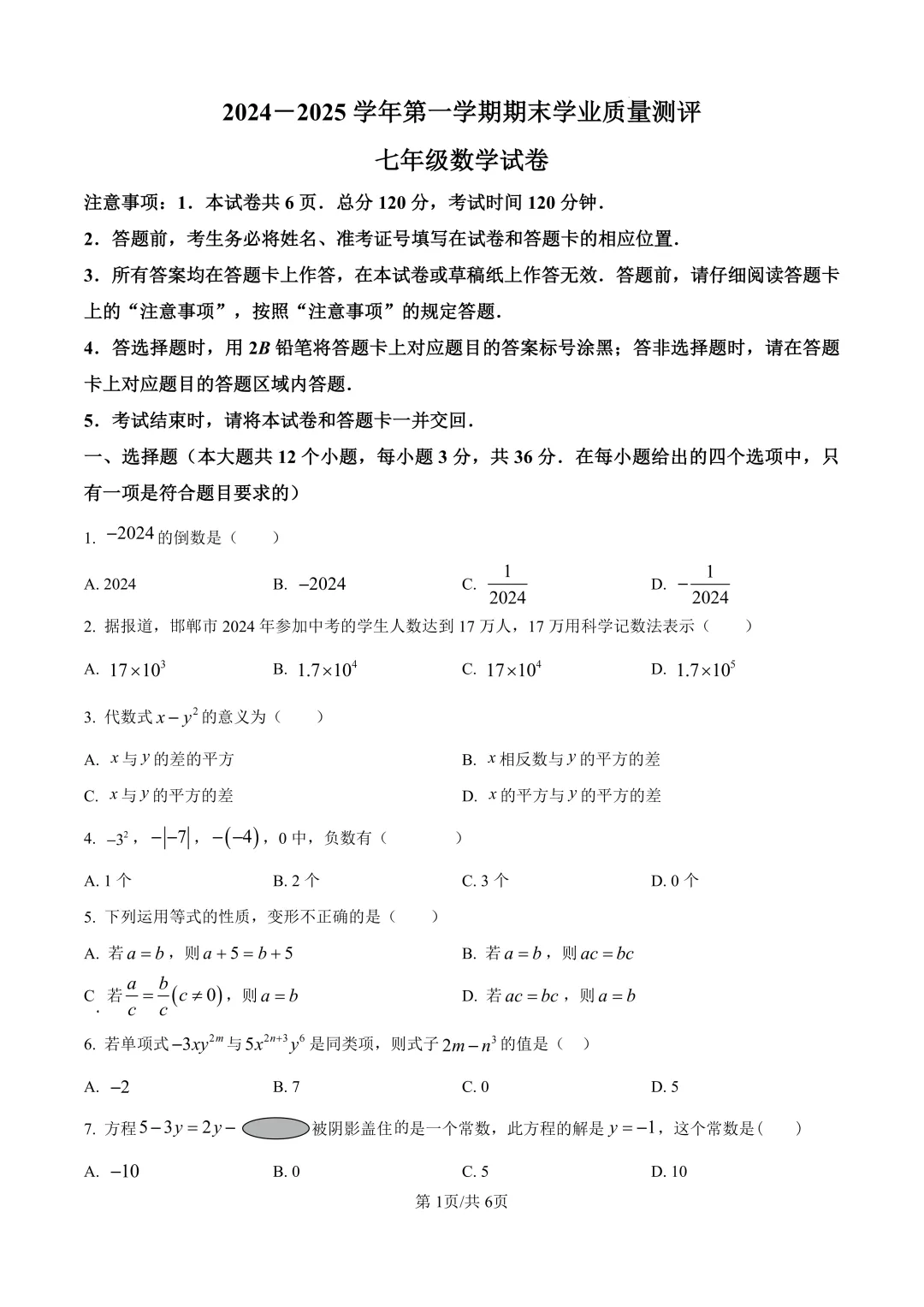邯郸市丛台区七上期末【数学】卷-可打印(有答案)