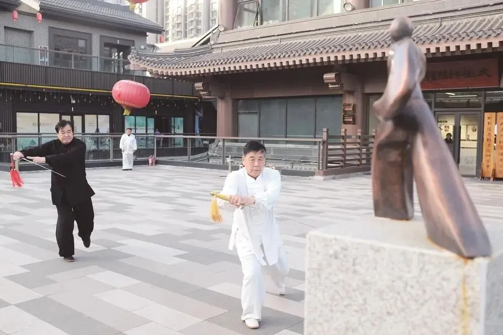 傍晚时分,华灯初上。邯郸道街区游人如织,太极神韵馆内,一天的最后一节体验课即将开始。几位刚下班的白领匆匆赶来,换上行功服;一对老年夫妇在展示墙前细细观看太极源流的介绍;馆外广场上,几个孩子正模仿着石柱上太极拳人物雕像的动作,嬉笑玩耍。