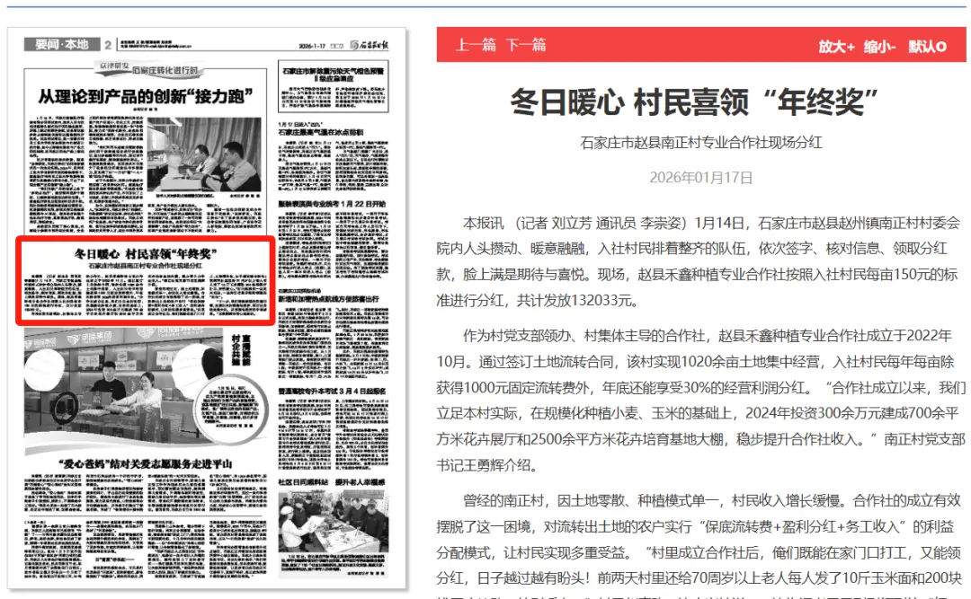 曾经的南正村,因土地零散、种植模式单一,村民收入增长缓慢。合作社的成立有效摆脱了这一困境,对流转出土地的农户实行“保底流转费+盈利分红+务工收入”的利益分配模式,让村民实现多重受益。“村里成立合作社后,俺们既能在家门口打工,又能领分红,日子越过越有盼头!前两天村里还给70周岁以上老人每人发了10斤玉米面和200块钱医疗补助,特别暖心。”村民赵素改一边高兴地说,一边为记者展示刚刚领到的“红包”。