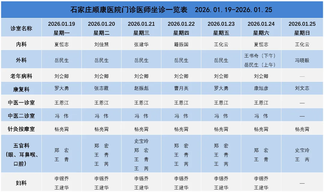 【出诊预告】石家庄顺康医院门诊专家及医师坐诊一览表(2026年1月19日-1月25日)