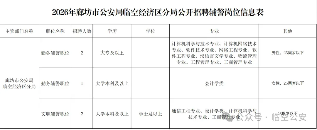 附件:2026年廊坊市公安局临空经济区分局公开招聘辅警岗位信息表