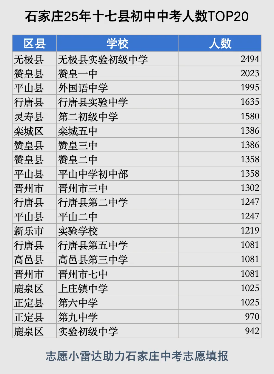 石家庄十七县25年初中中考人数TOP20排行榜!你的母校上榜了吗?