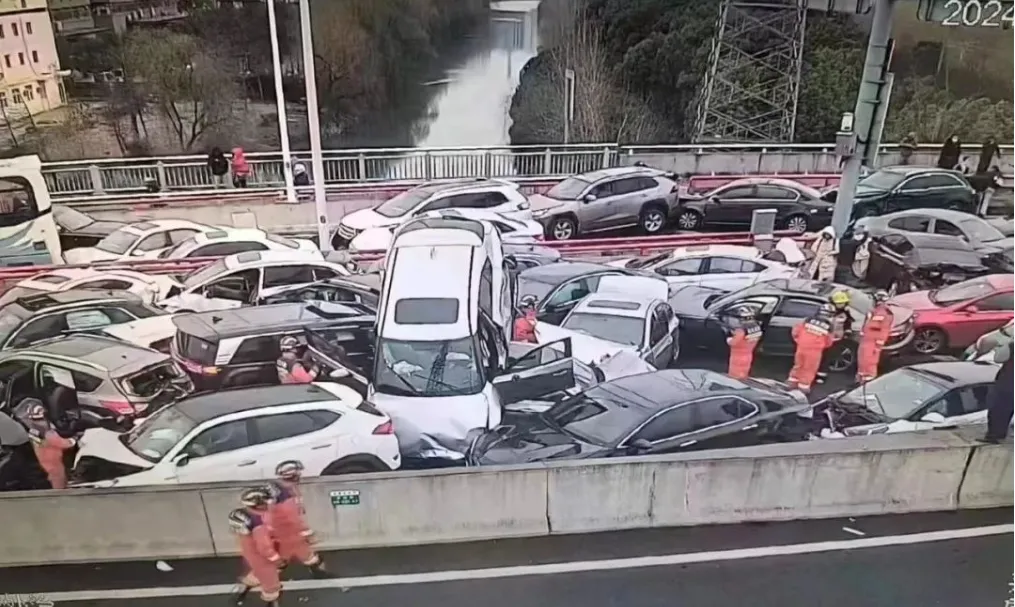 突发!道路结冰致高架上百辆车相撞?有人员受伤!