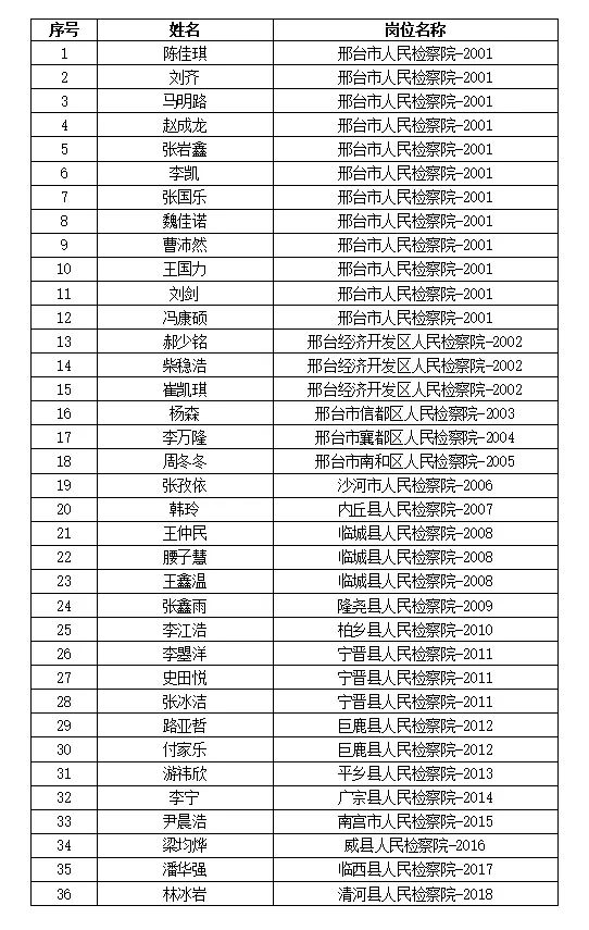 根据《邢台市人民检察院关于公开招聘人民检察院聘用制书记员的公告》规定,经网上报名、资格审查、综合能力测试、面试、体检、考察等程序,拟聘用以下36人为邢台市人民检察院聘用制书记员。