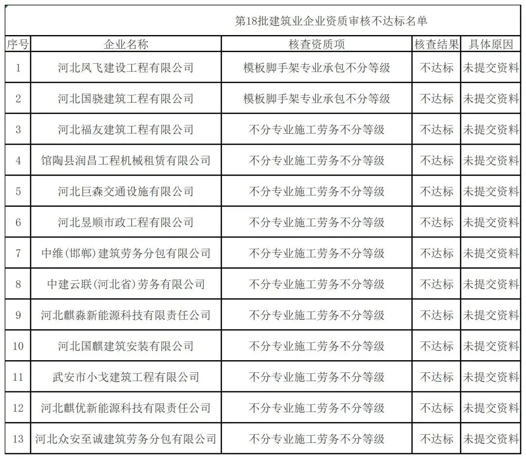 按照《邯郸市人民政府关于印发邯郸市行政审批告知承诺制管理暂行办法的通知》要求,我局对近期审批局推送的新办理资质企业以及部分资质延期企业达标情况进行了核查。发现河北凤飞建设工程有限公司等13家建筑业企业资质不达标。