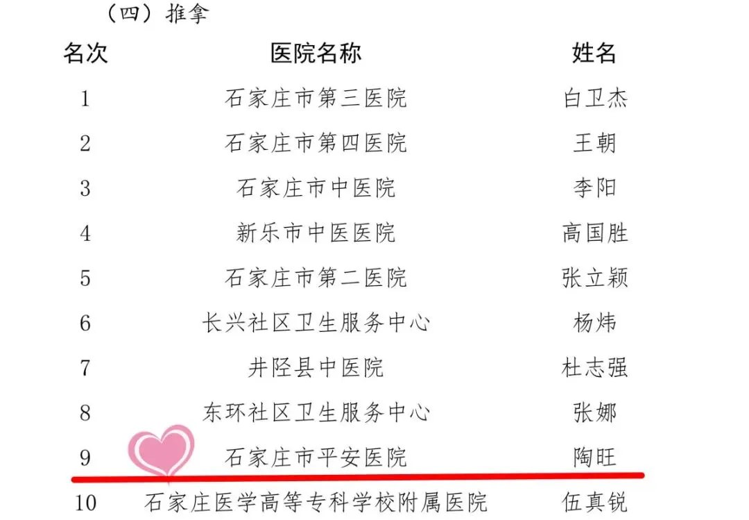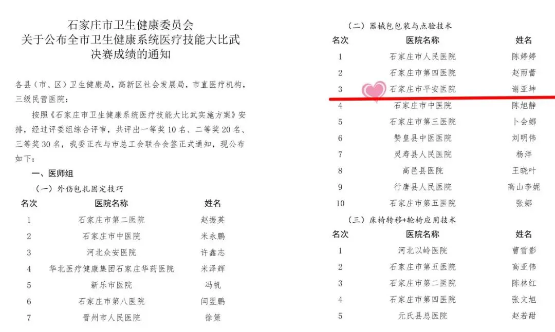 近日,石家庄市卫生健康委员会正式公布了全市卫生健康系统首届医疗技能大比武的决赛成绩,石家庄平安医院捷报频传,消毒供应室护士谢亚坤,风湿病科医师王若冰和康复科医师林晓云、陶旺及护士张伟佳凭借出色的专业技能和扎实的理论功底,在比赛中取得佳绩。