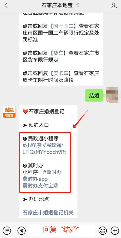 点击下方名片关注【石家庄本地宝】,在聊天对话框回复【结婚】,即可获取预约办理入口。