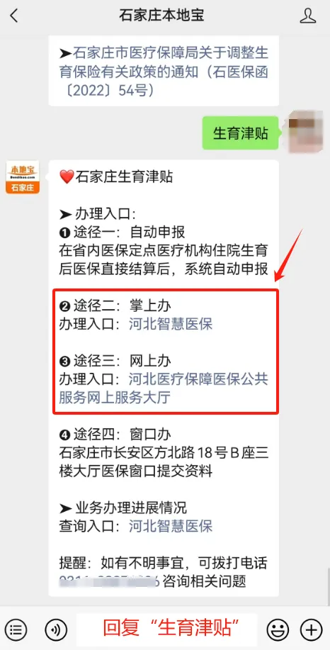 👉推荐服务:在【石家庄本地宝】公众号聊天对话框回复【生育津贴】,即可获取掌上办及网上办的办理入口