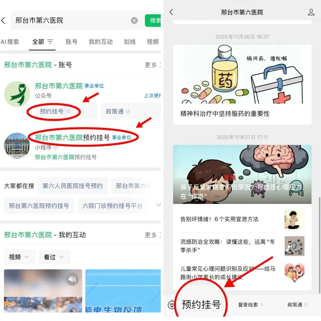 打开微信搜索 “邢台市第六医院”,任选以下便捷方式进入预约系统: