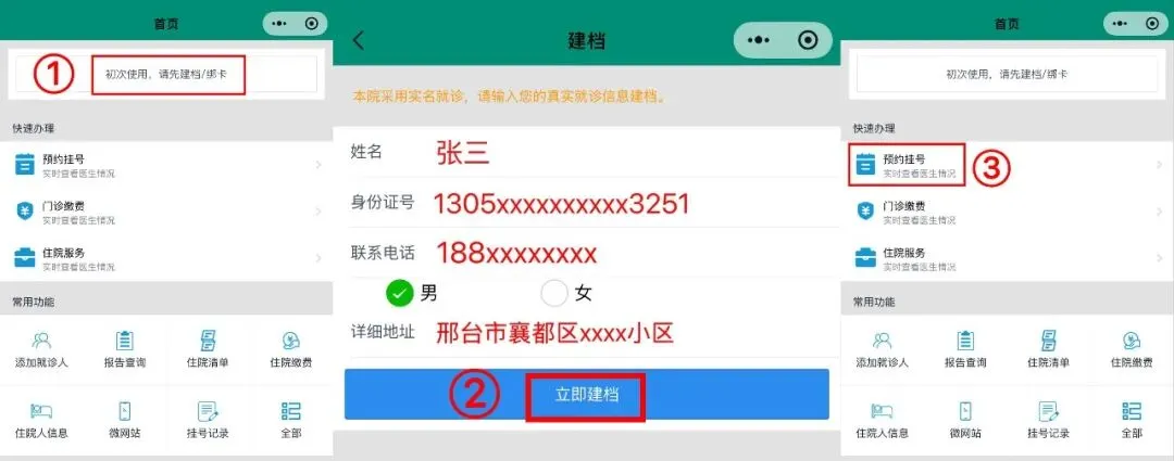 完成电子就诊档案创建或实体就诊卡绑定(本院实行实名就诊制度,务必提供真实有效信息,确保建档顺利)。