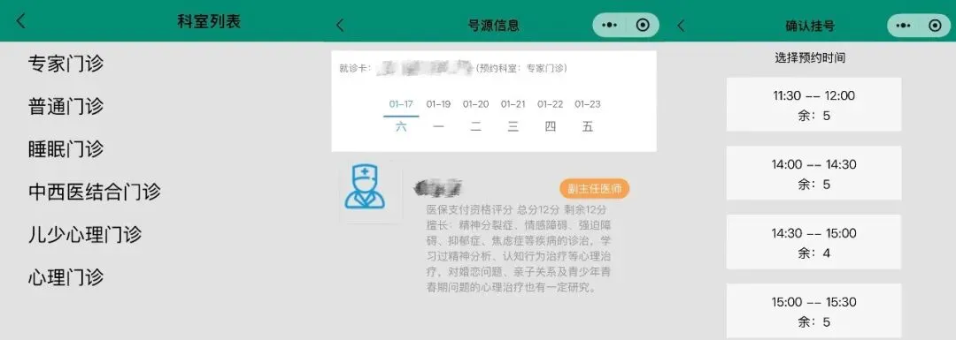 根据就医需求选择就诊科室:涵盖专家门诊、普通门诊,以及睡眠门诊、中西医结合门诊、儿少心理门诊、心理门诊等特色科室,满足不同诊疗需求;