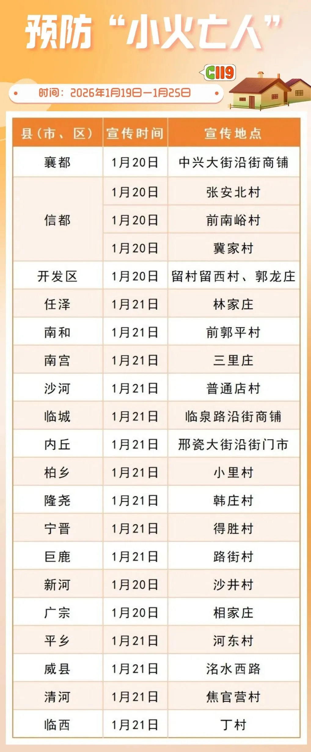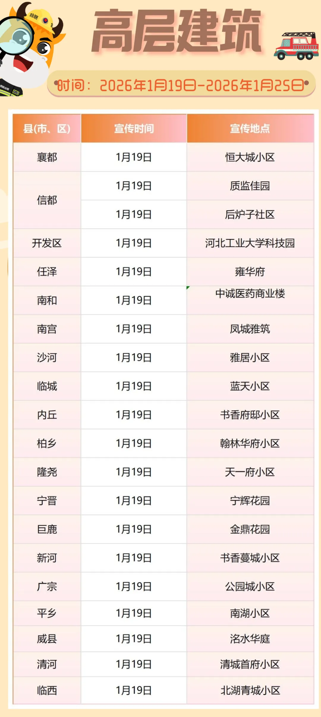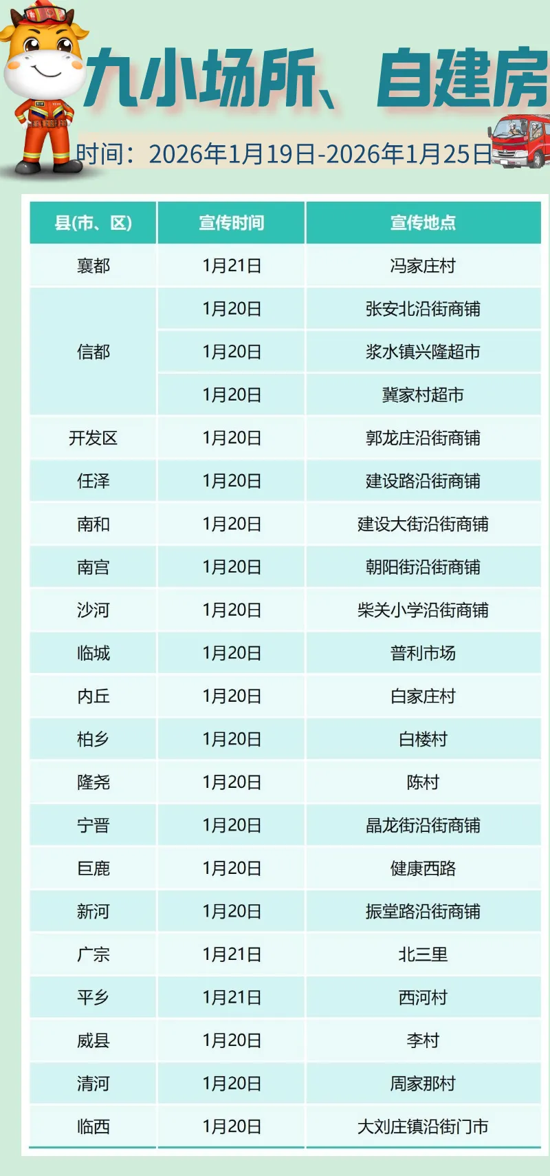 邢台消防宣传“五进”活动周计划(1月19日至25日),聚焦高层、九小、自建房、企业、农村等场所