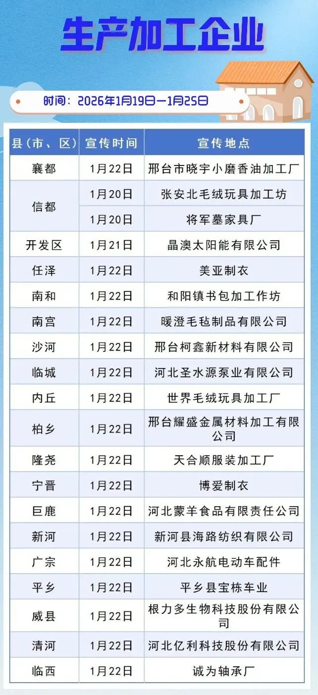 以下为邢台消防1月19日至25日宣传“五进”活动周计划: