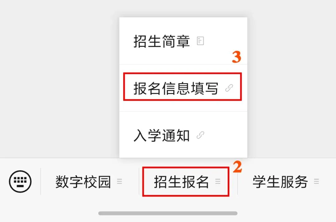 第二步:点击“发消息”-“招生报名”-“报名信息填写”