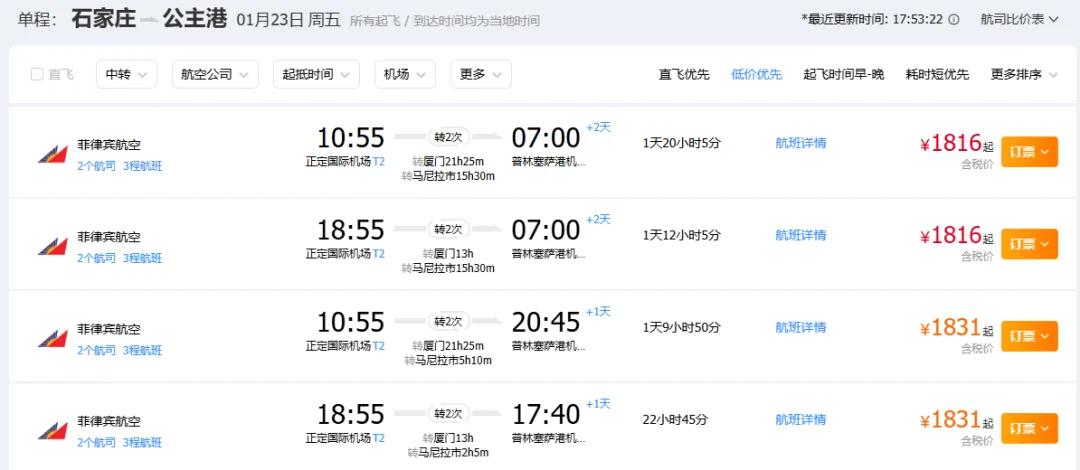 目前石家庄至菲律宾没有直飞航线,需经上海、厦门、成都等城市进行中转。