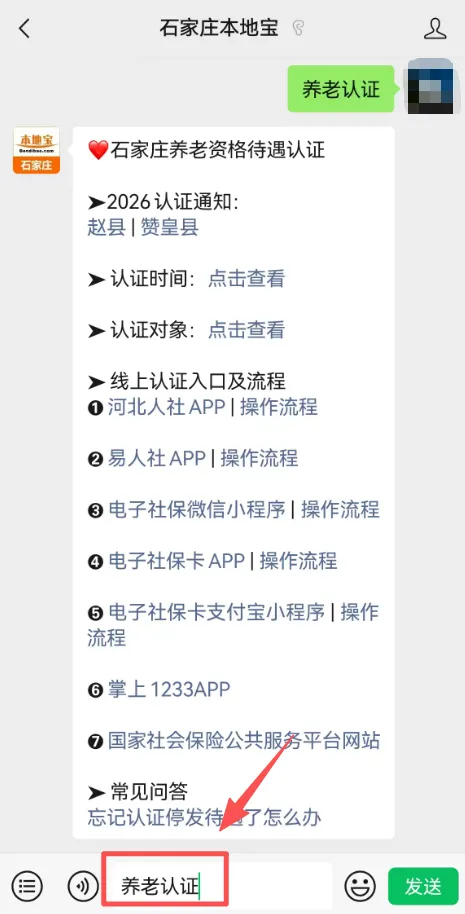 👉推荐服务:扫描或长按识别下方二维码,关注【石家庄本地宝】公众号,把菜单栏切换成对话框,在底部对话框回复【养老认证】,即可获取养老资格认证办理入口、各入口办理流程等。