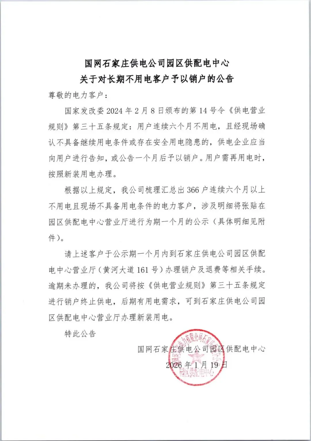 >国网石家庄供电公司园区供配电中心关于对长期不用电客户予以销户的公告