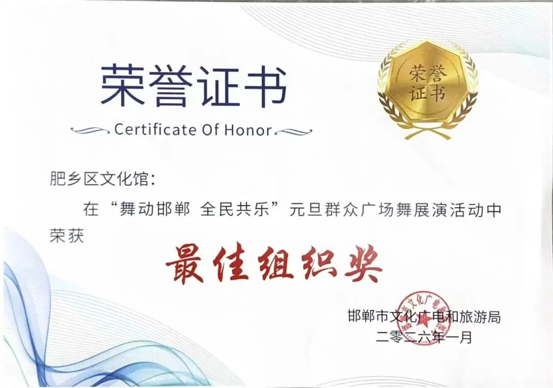 2026年12月28日,由邯郸市文化广电和旅游局主办的“舞动邯郸,全民共乐”元旦群众广场舞展演在邯郸大剧院南广场隆重举行。我区文化馆推荐的舞蹈作品《美丽中国》荣获“最佳组织奖”与“最佳风采奖”。