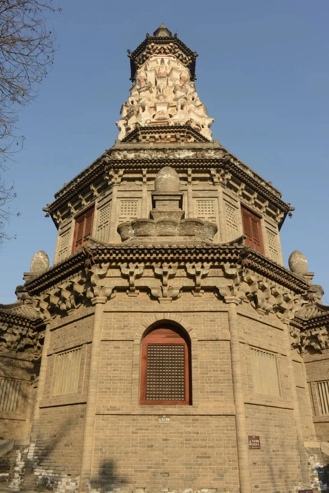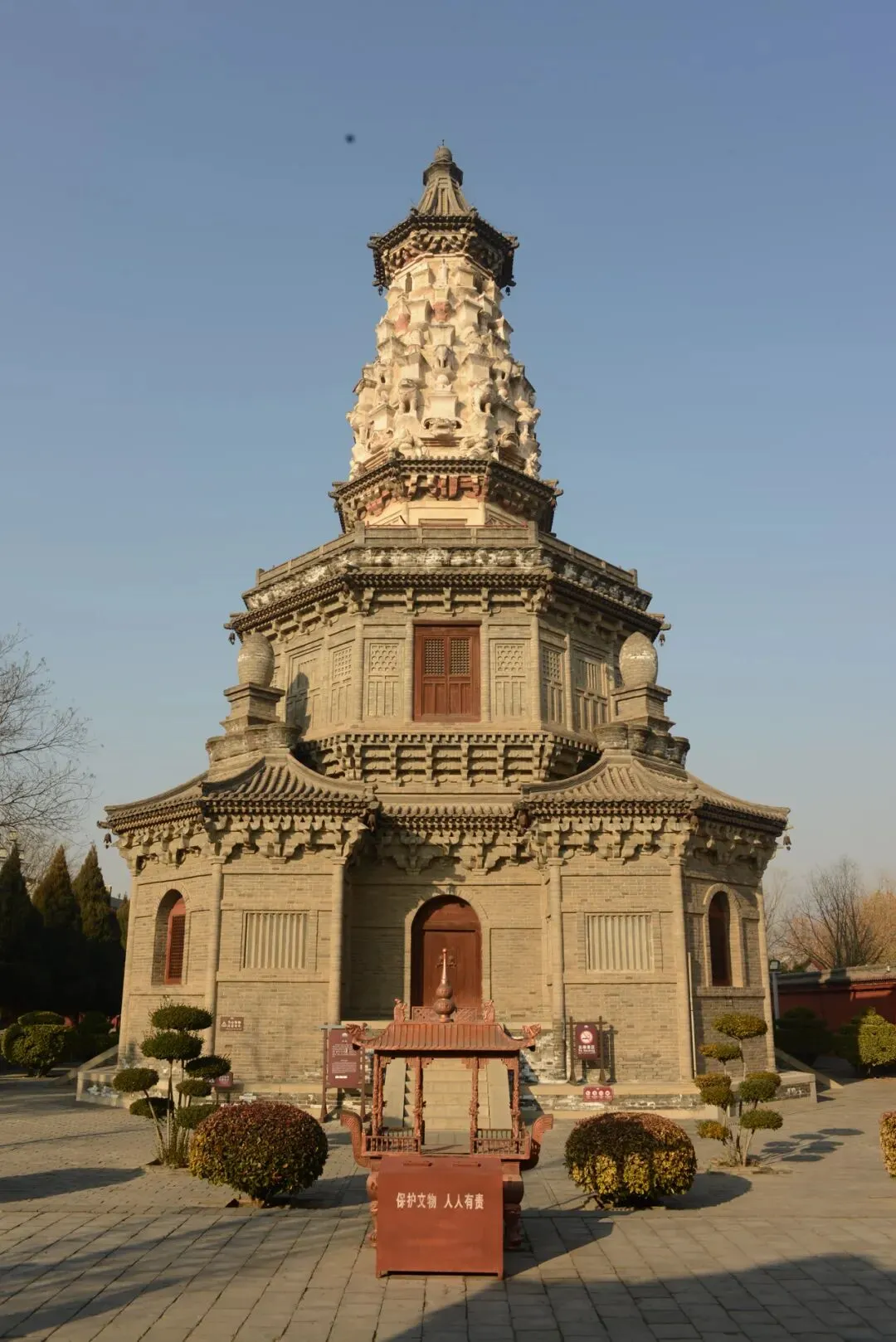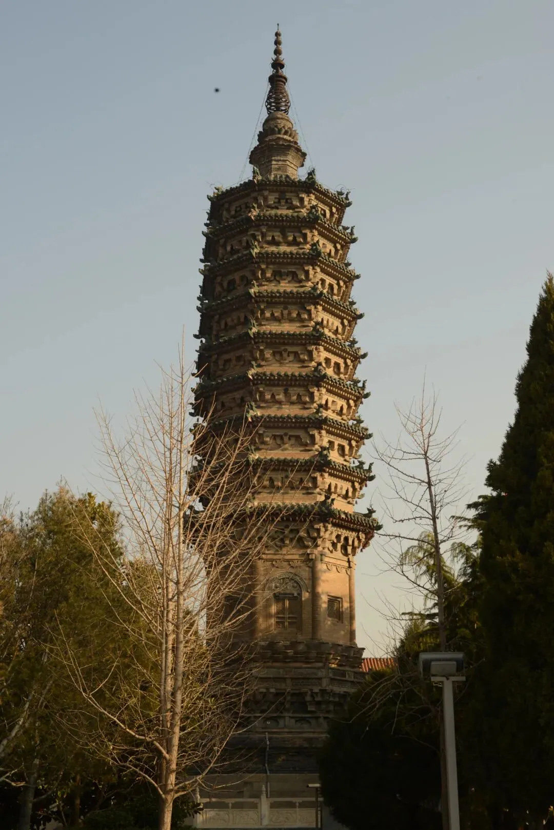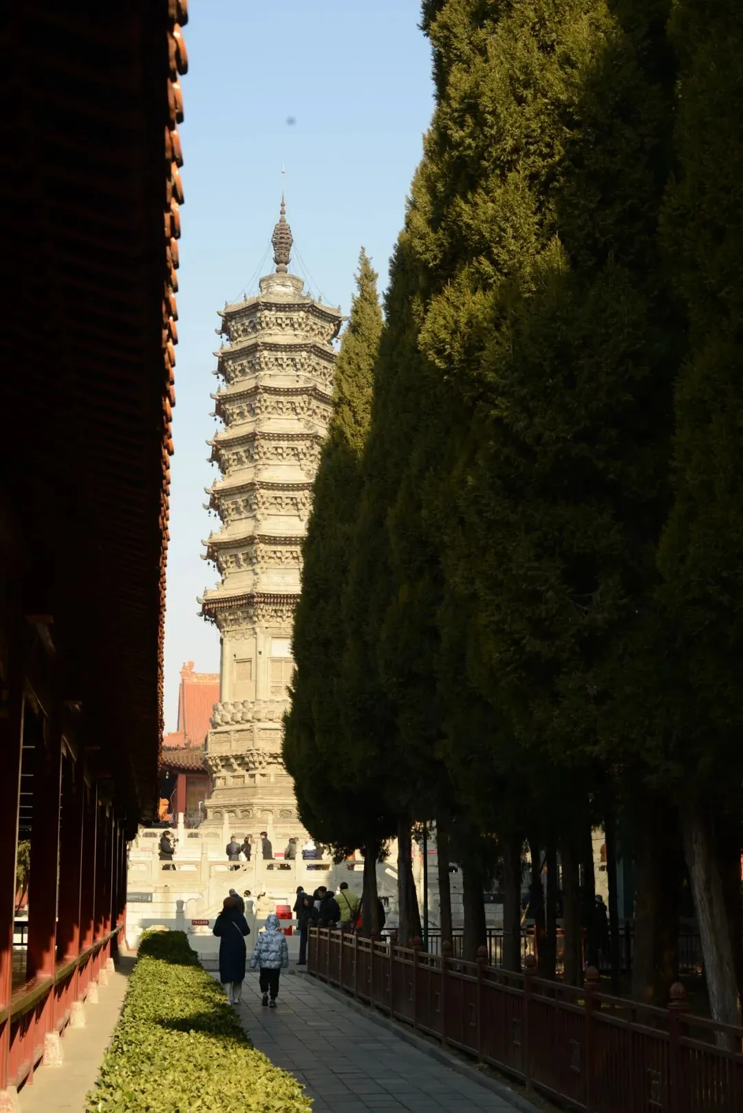 官网介绍的塔:“澄灵塔高30.47米,为八角九级砖仿木构密檐式塔,建在八角形砖砌台基上,台上为石砌基座,再上为砖砌须弥座,束腰正面镶嵌清雍正皇帝谕旨石刻,其余各面均有二壶门花饰。须弥座上是由勾栏、斗拱组成的一围平座,平座上以三层仰莲承托塔身。第一层四正面做砖雕拱形假门,四侧面饰方形假窗,正面圆形假门上端嵌“唐临济慧照澄灵塔”石匾。第二层向上,层高骤减,密檐相接,形成柔和协调的轮廓线。塔顶覆绿琉璃瓦,塔刹由仰莲、宝瓶、相轮、圆光、宝盖、仰月、宝珠等组成。”