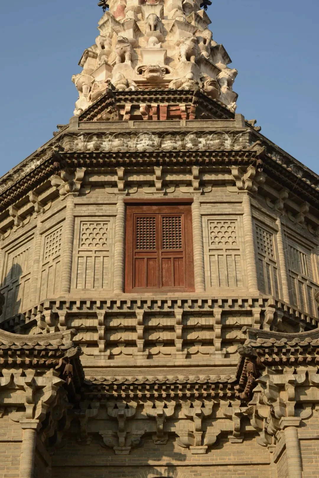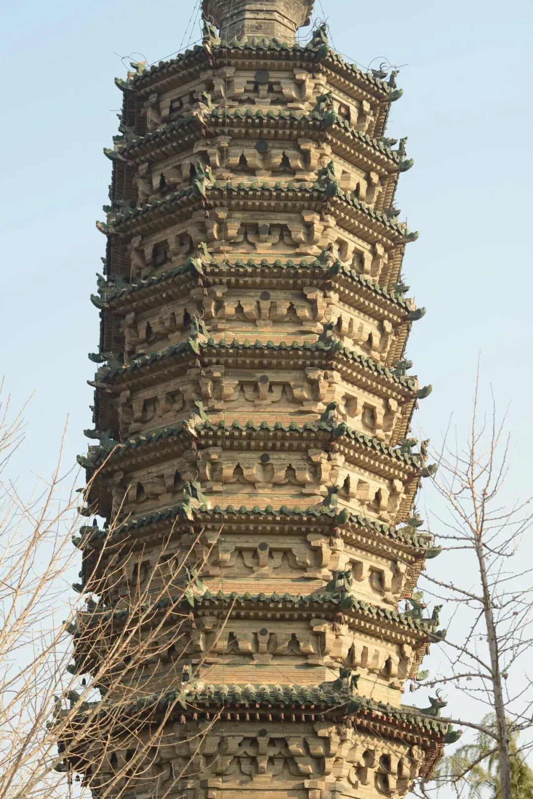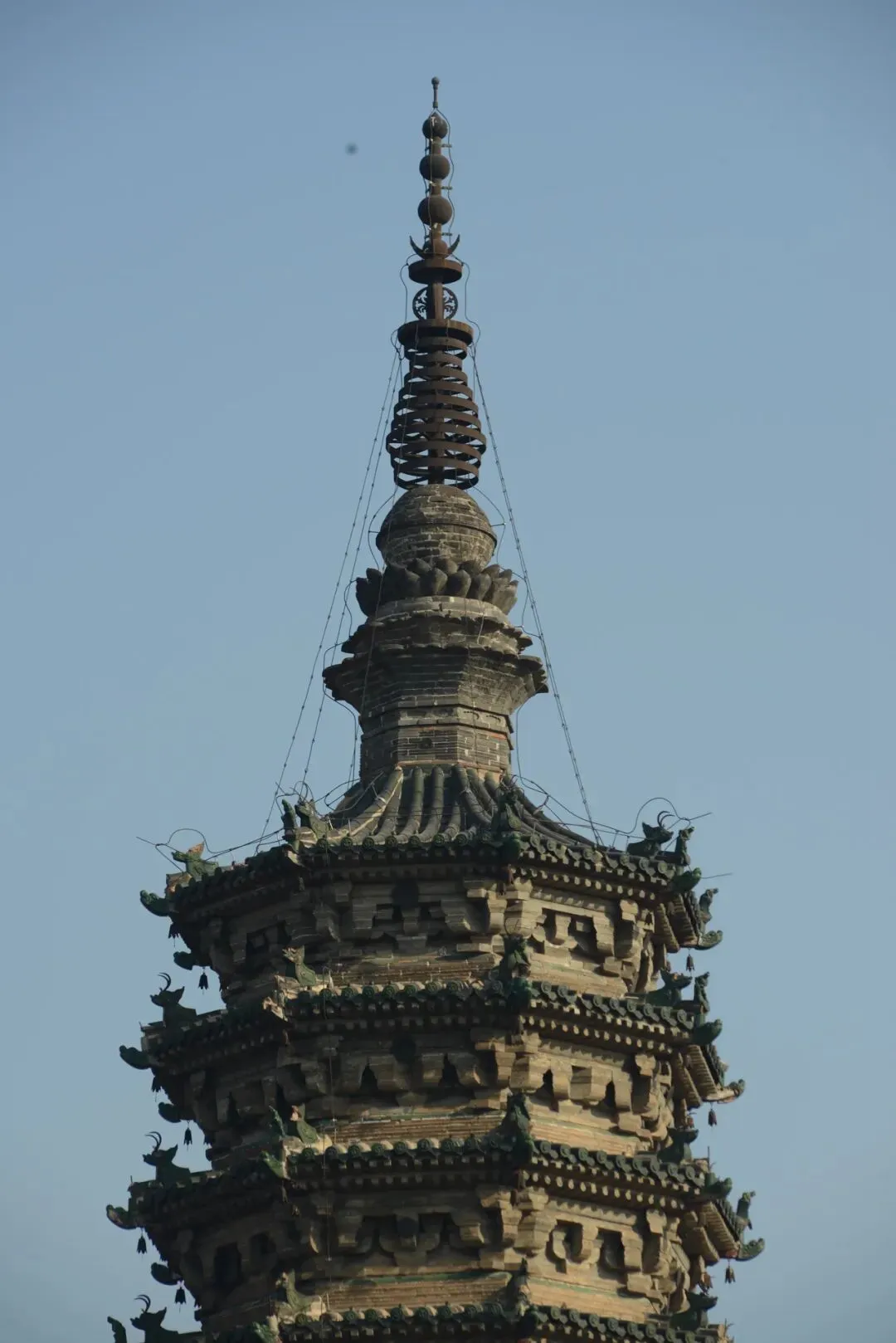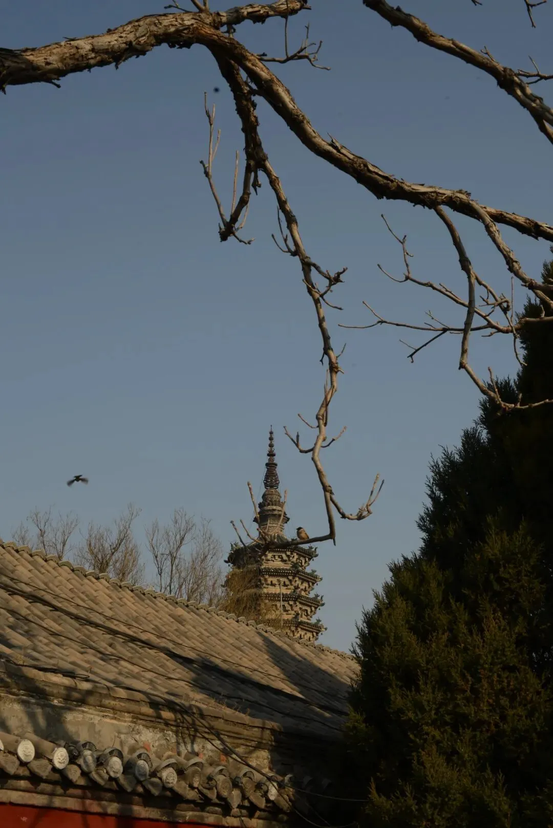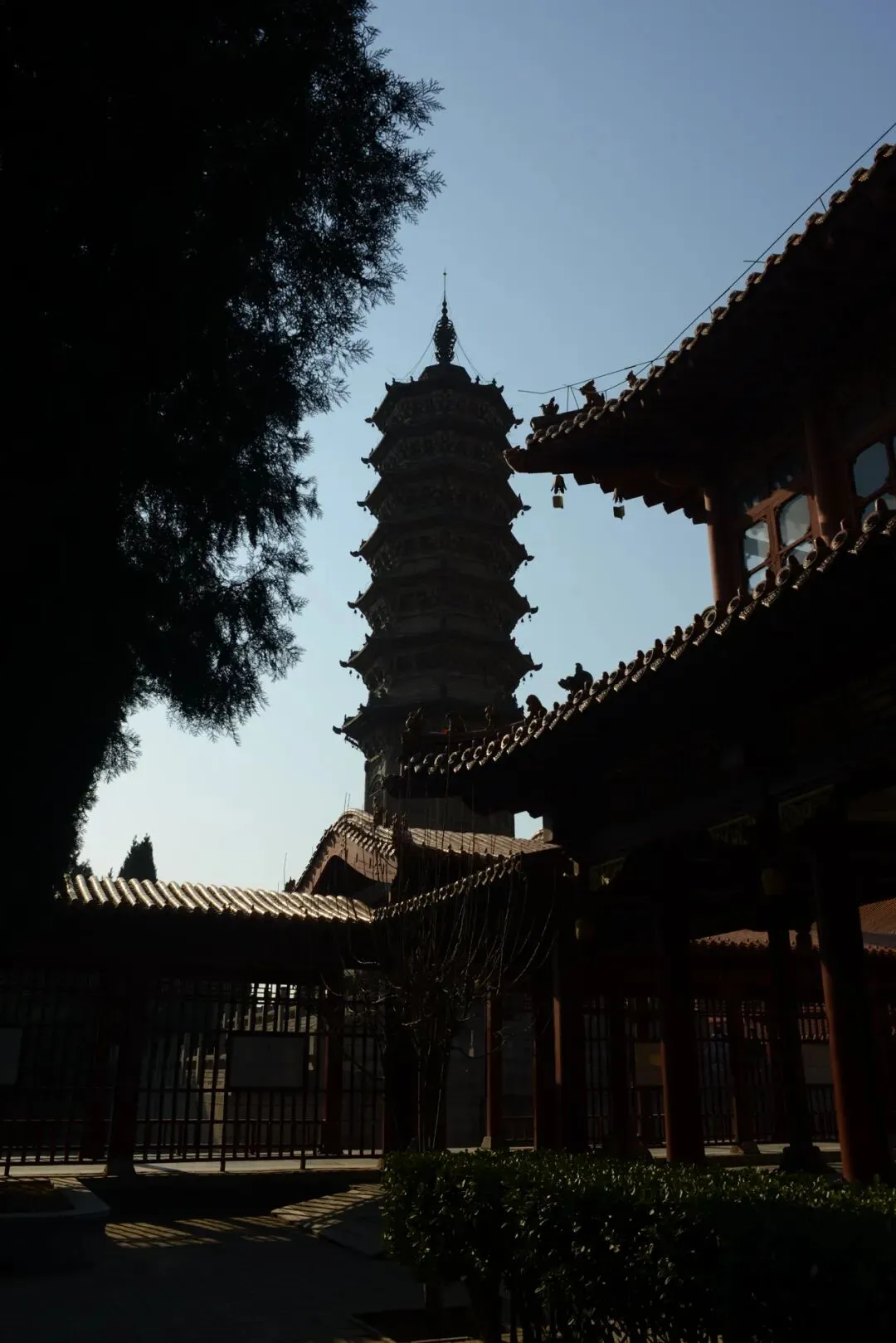 官网介绍的塔:“澄灵塔高30.47米,为八角九级砖仿木构密檐式塔,建在八角形砖砌台基上,台上为石砌基座,再上为砖砌须弥座,束腰正面镶嵌清雍正皇帝谕旨石刻,其余各面均有二壶门花饰。须弥座上是由勾栏、斗拱组成的一围平座,平座上以三层仰莲承托塔身。第一层四正面做砖雕拱形假门,四侧面饰方形假窗,正面圆形假门上端嵌“唐临济慧照澄灵塔”石匾。第二层向上,层高骤减,密檐相接,形成柔和协调的轮廓线。塔顶覆绿琉璃瓦,塔刹由仰莲、宝瓶、相轮、圆光、宝盖、仰月、宝珠等组成。”