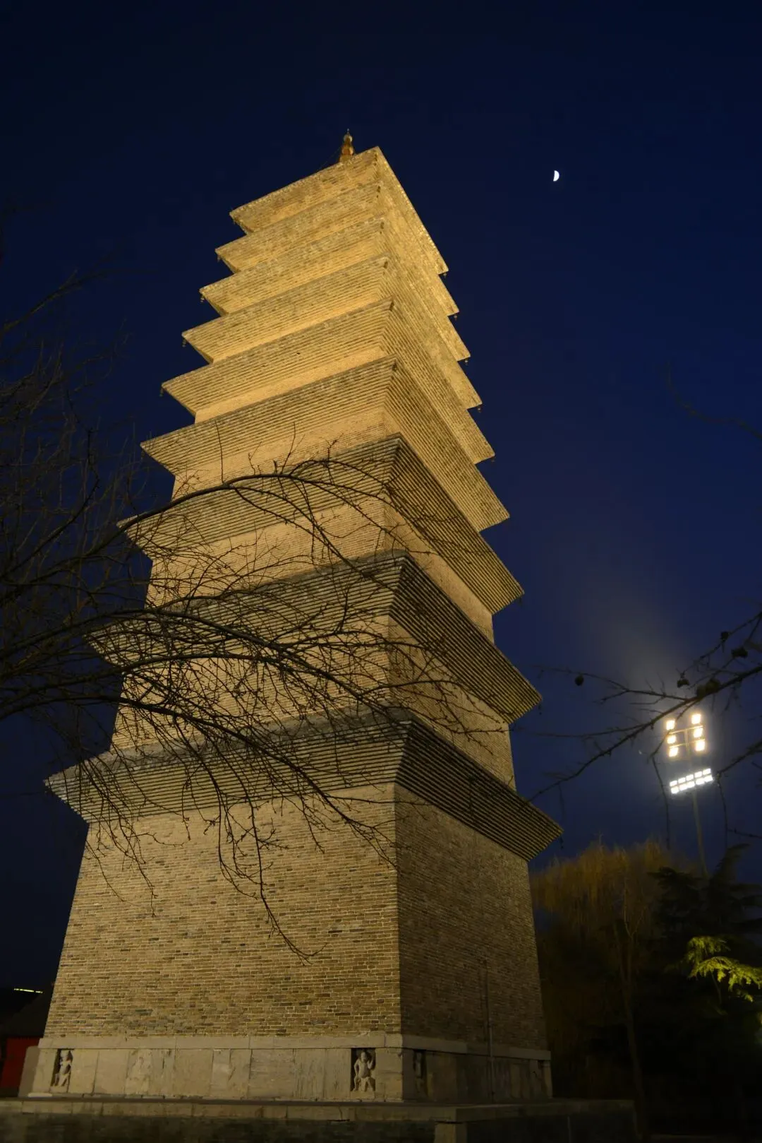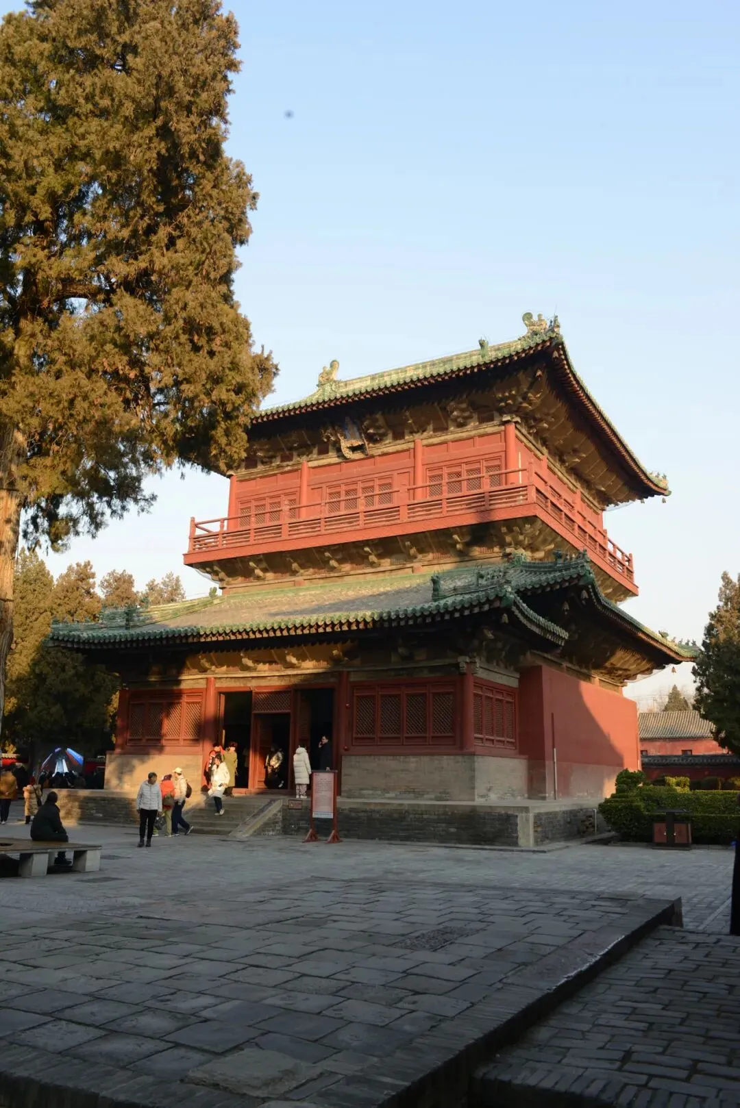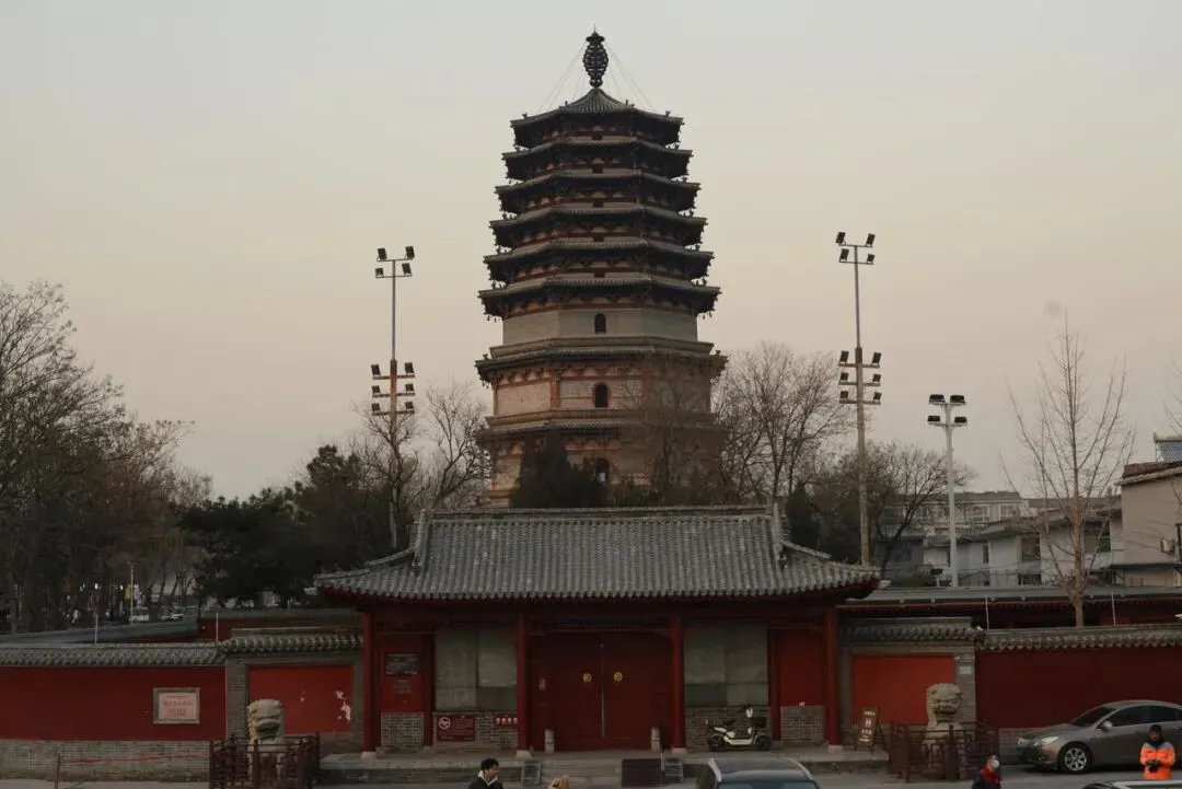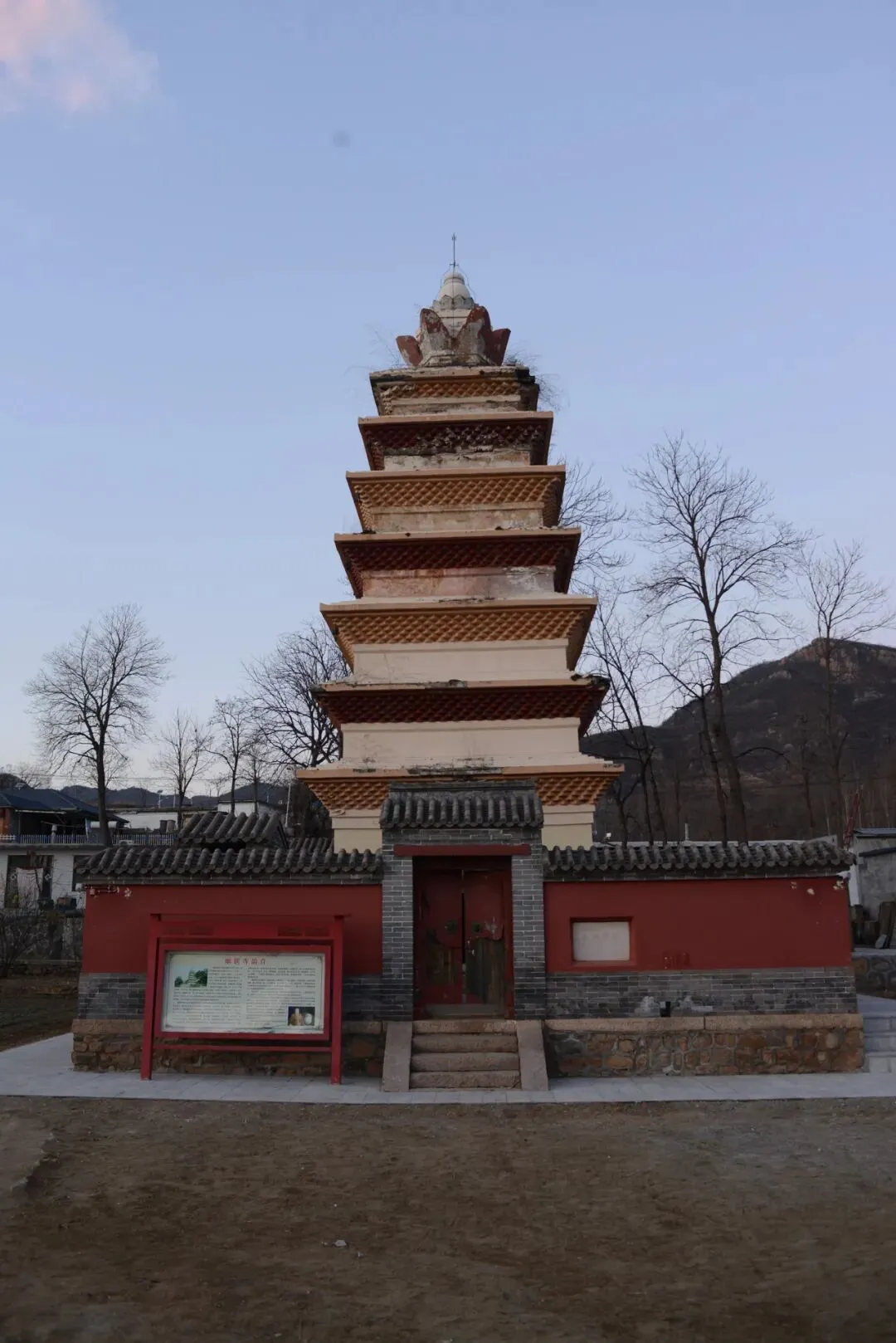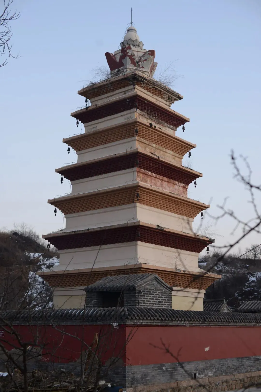 官网介绍的塔:“澄灵塔高30.47米,为八角九级砖仿木构密檐式塔,建在八角形砖砌台基上,台上为石砌基座,再上为砖砌须弥座,束腰正面镶嵌清雍正皇帝谕旨石刻,其余各面均有二壶门花饰。须弥座上是由勾栏、斗拱组成的一围平座,平座上以三层仰莲承托塔身。第一层四正面做砖雕拱形假门,四侧面饰方形假窗,正面圆形假门上端嵌“唐临济慧照澄灵塔”石匾。第二层向上,层高骤减,密檐相接,形成柔和协调的轮廓线。塔顶覆绿琉璃瓦,塔刹由仰莲、宝瓶、相轮、圆光、宝盖、仰月、宝珠等组成。”