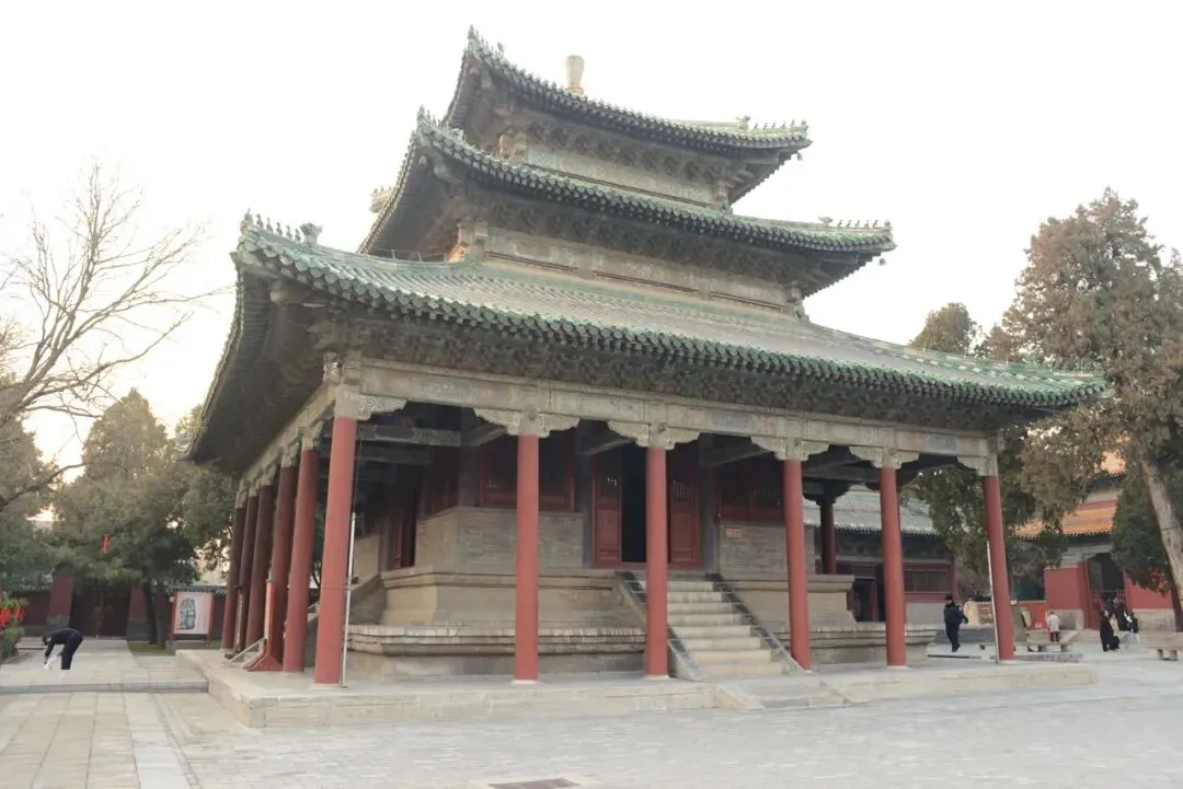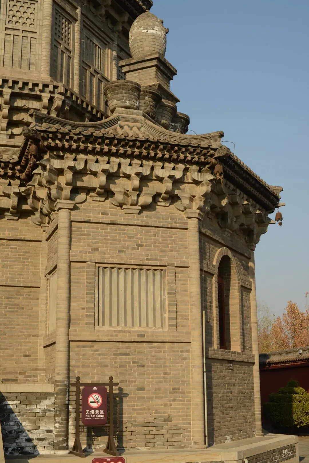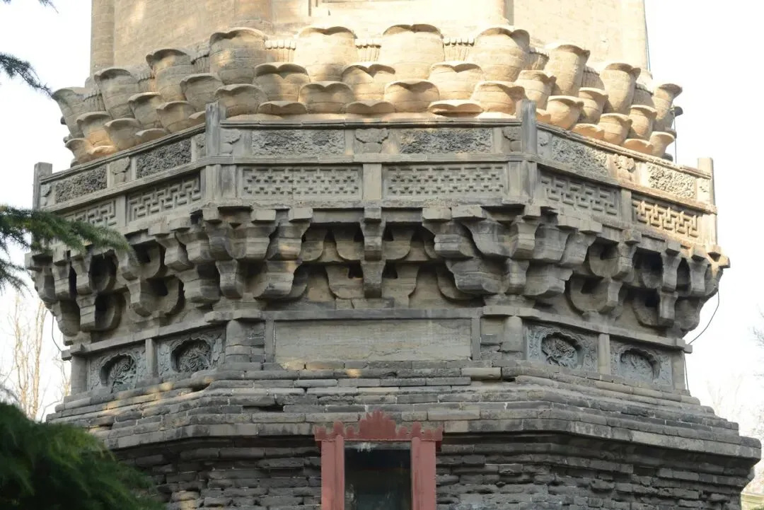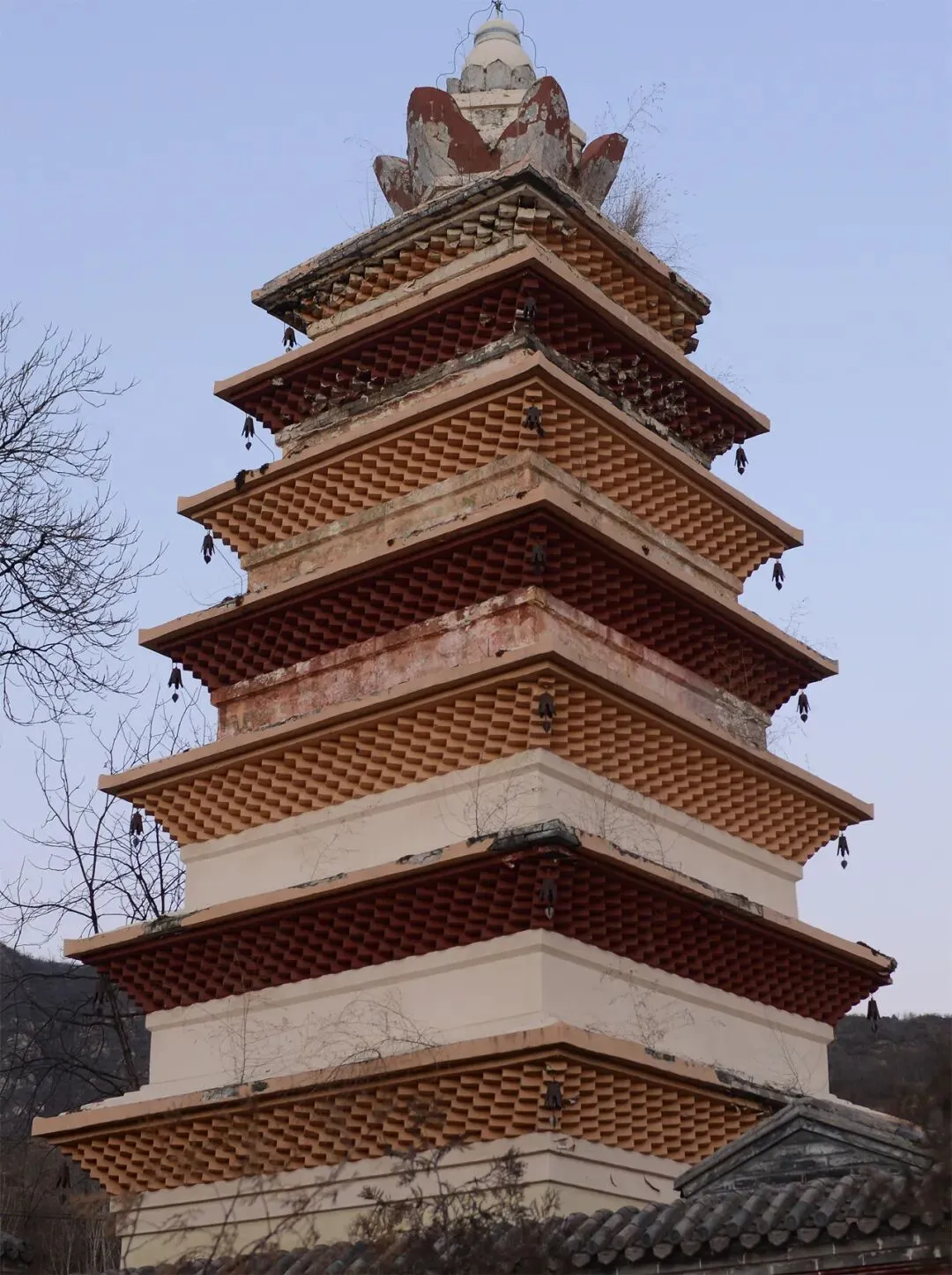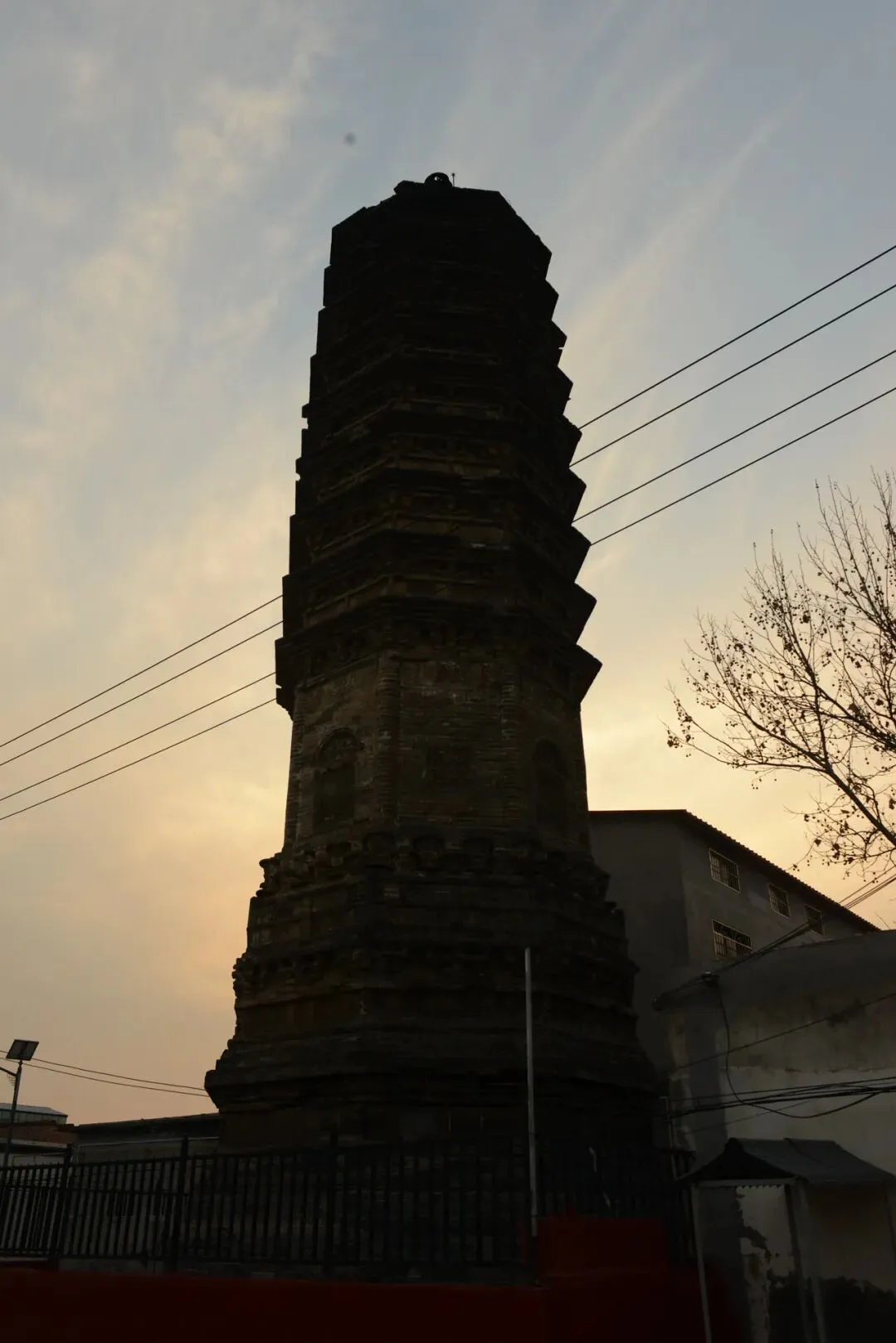 官网介绍的塔:“澄灵塔高30.47米,为八角九级砖仿木构密檐式塔,建在八角形砖砌台基上,台上为石砌基座,再上为砖砌须弥座,束腰正面镶嵌清雍正皇帝谕旨石刻,其余各面均有二壶门花饰。须弥座上是由勾栏、斗拱组成的一围平座,平座上以三层仰莲承托塔身。第一层四正面做砖雕拱形假门,四侧面饰方形假窗,正面圆形假门上端嵌“唐临济慧照澄灵塔”石匾。第二层向上,层高骤减,密檐相接,形成柔和协调的轮廓线。塔顶覆绿琉璃瓦,塔刹由仰莲、宝瓶、相轮、圆光、宝盖、仰月、宝珠等组成。”