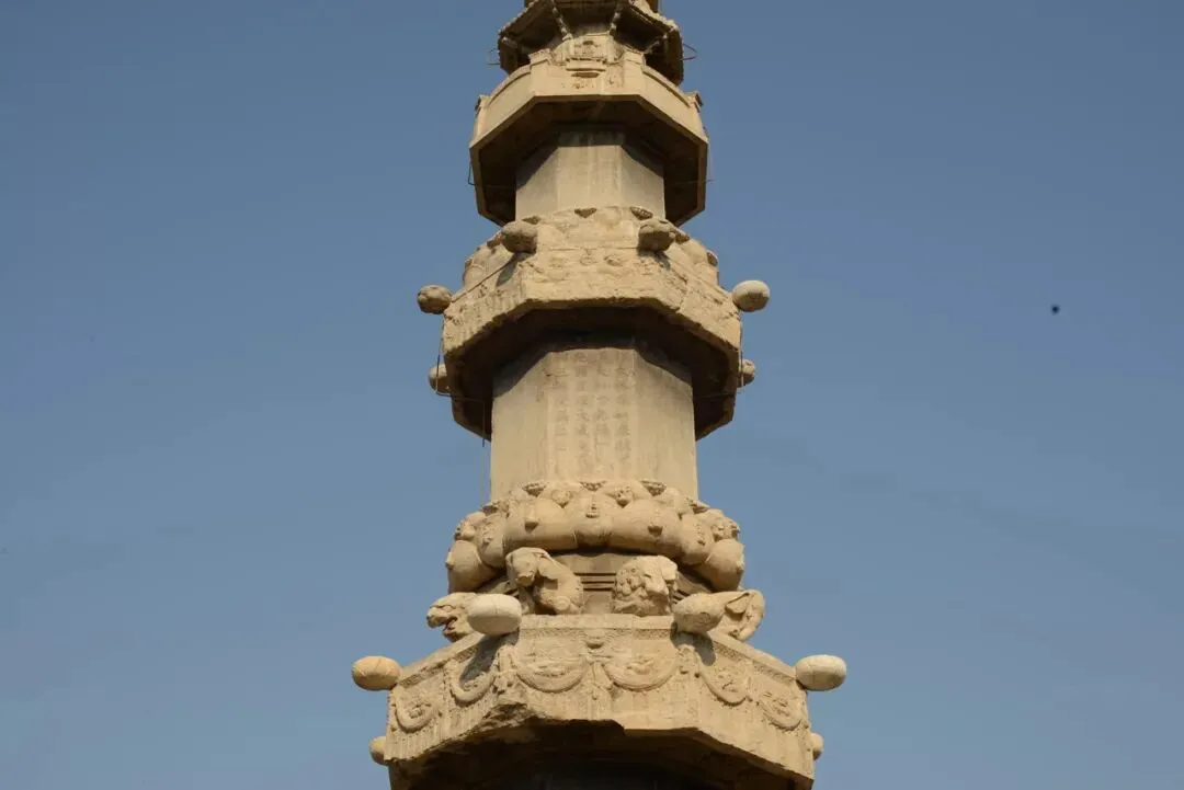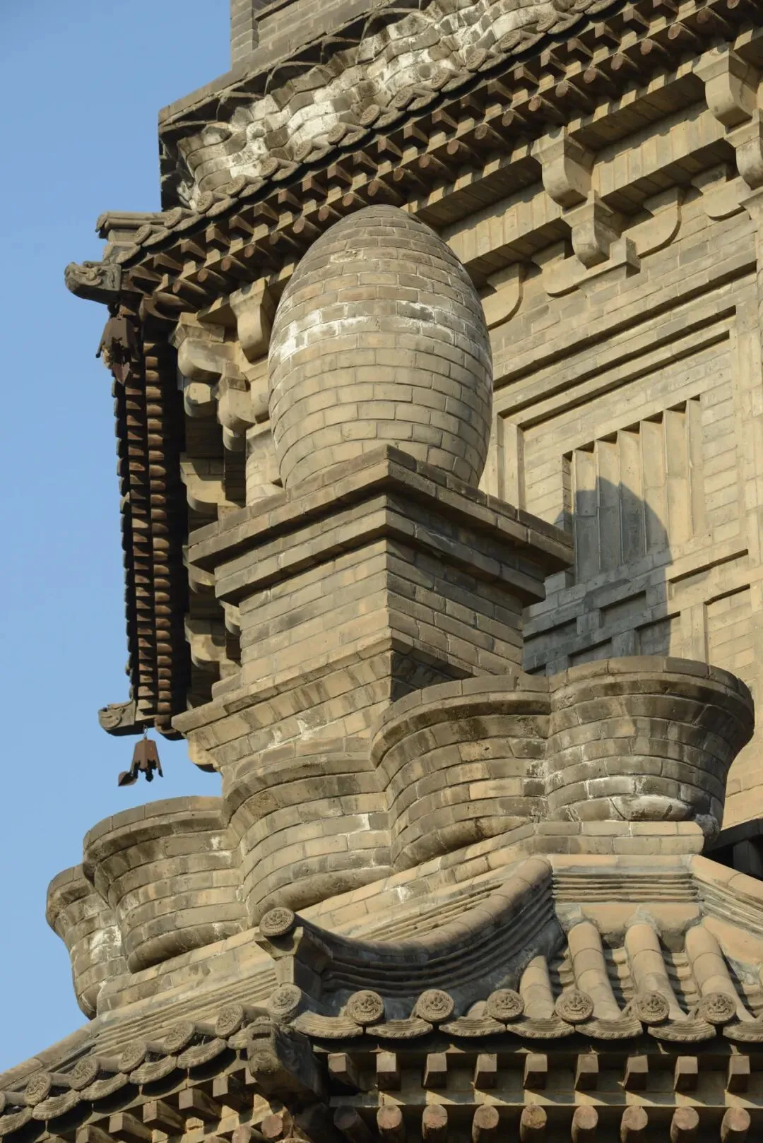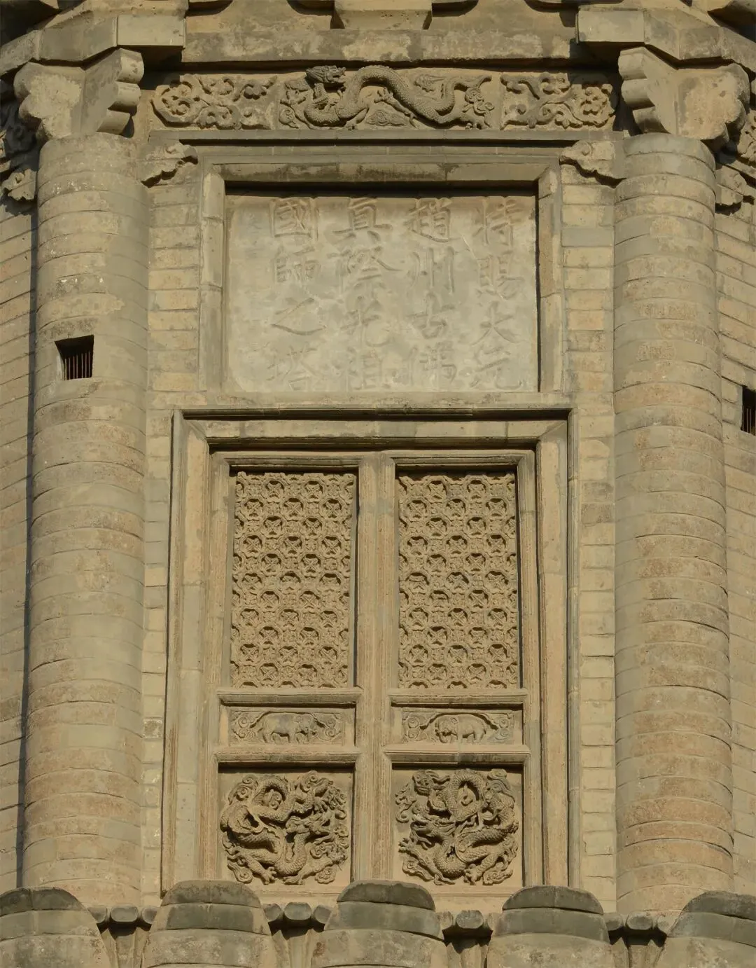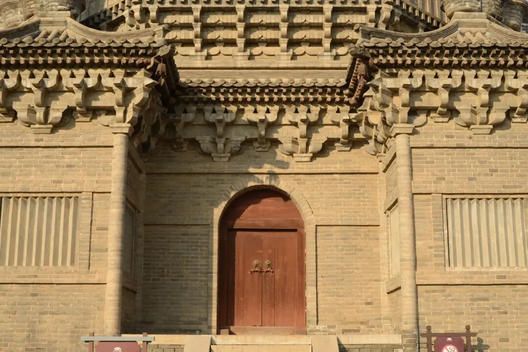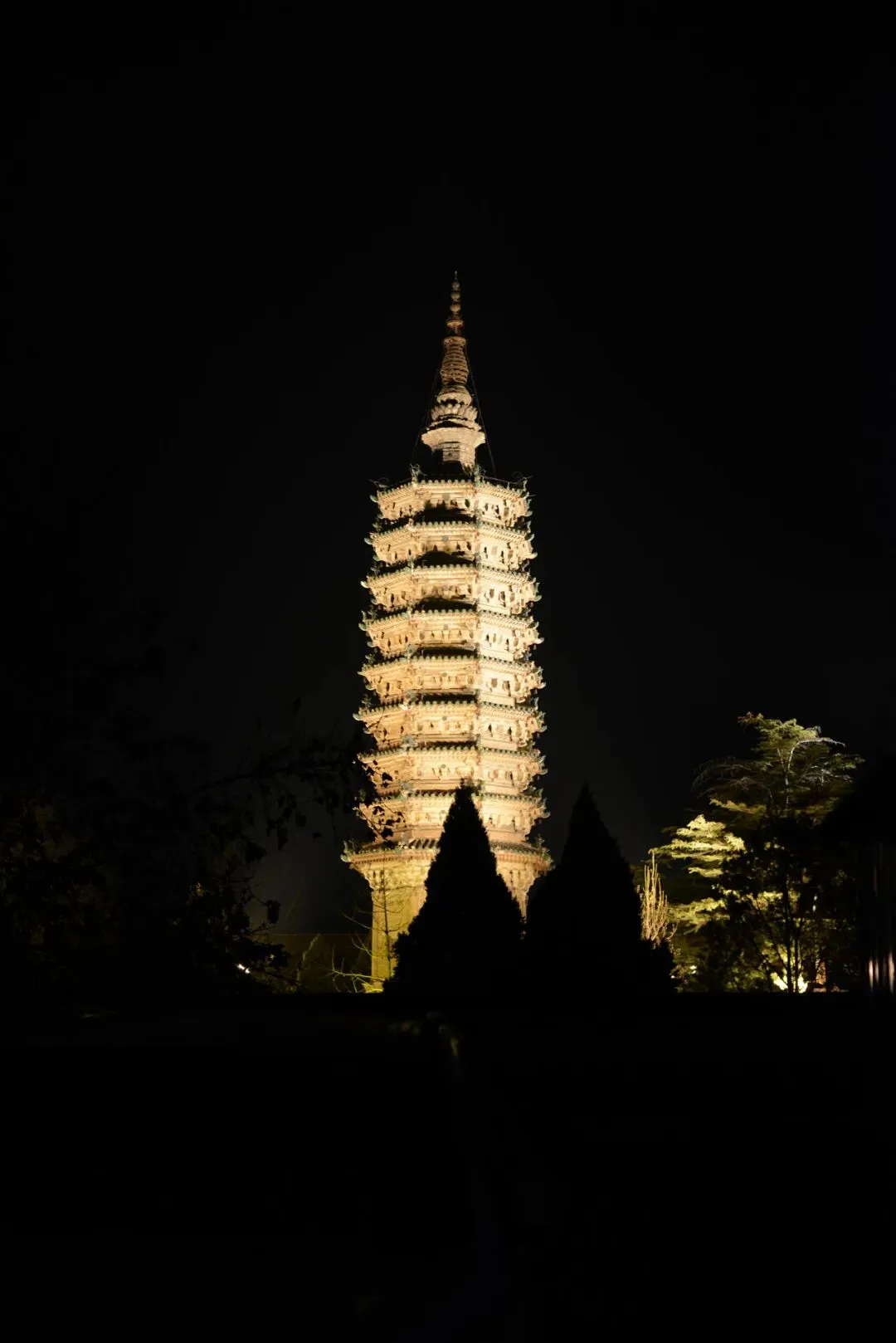 官网介绍的塔:“澄灵塔高30.47米,为八角九级砖仿木构密檐式塔,建在八角形砖砌台基上,台上为石砌基座,再上为砖砌须弥座,束腰正面镶嵌清雍正皇帝谕旨石刻,其余各面均有二壶门花饰。须弥座上是由勾栏、斗拱组成的一围平座,平座上以三层仰莲承托塔身。第一层四正面做砖雕拱形假门,四侧面饰方形假窗,正面圆形假门上端嵌“唐临济慧照澄灵塔”石匾。第二层向上,层高骤减,密檐相接,形成柔和协调的轮廓线。塔顶覆绿琉璃瓦,塔刹由仰莲、宝瓶、相轮、圆光、宝盖、仰月、宝珠等组成。”