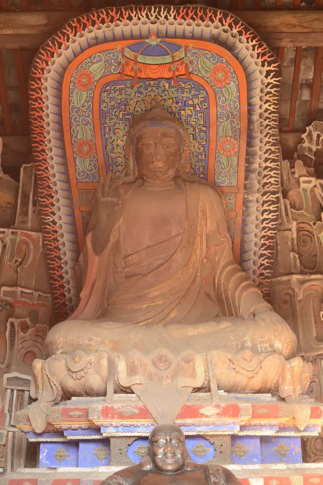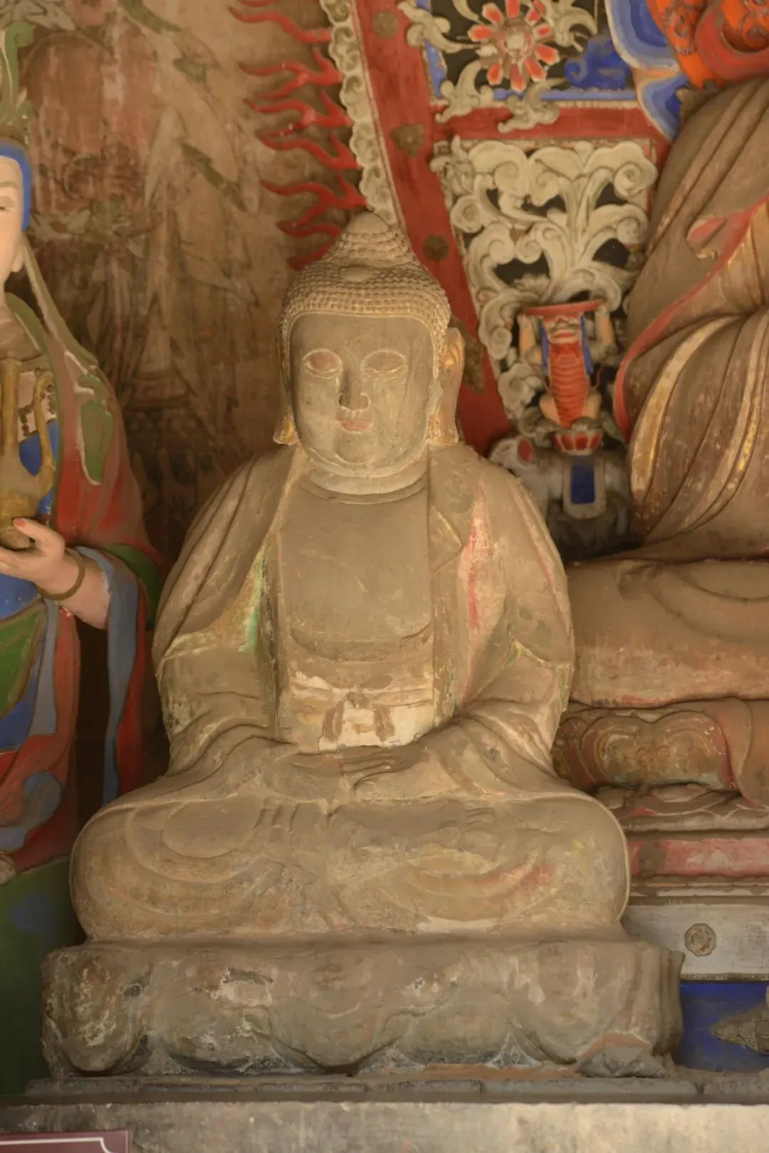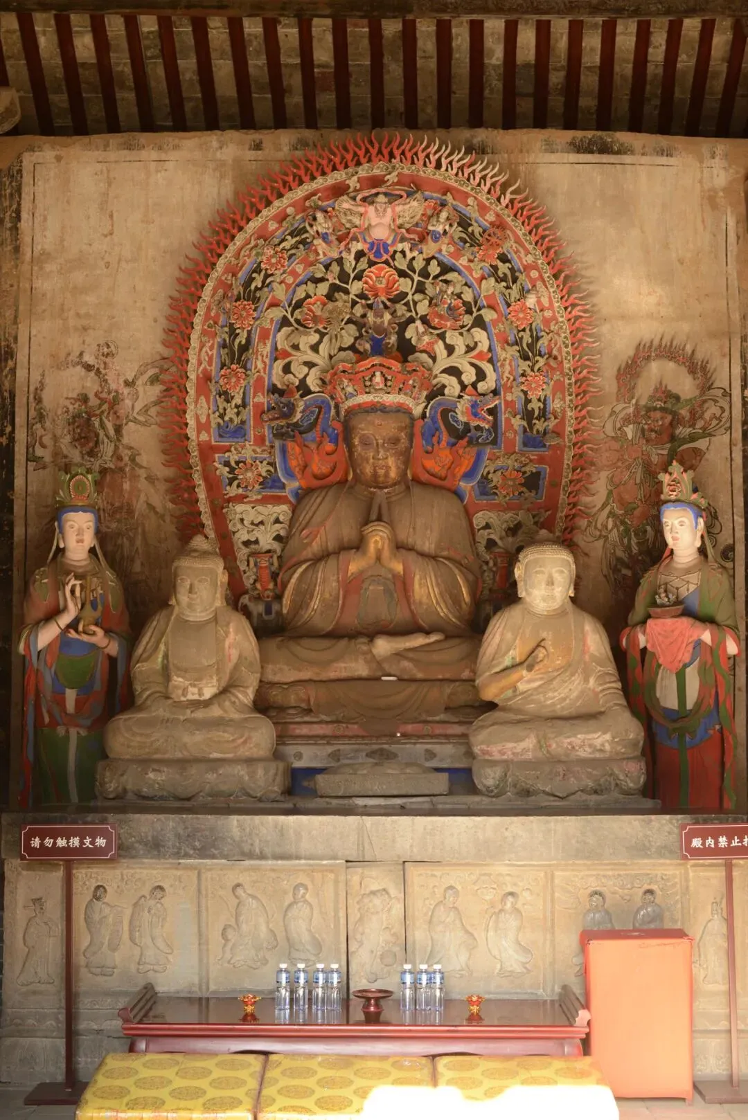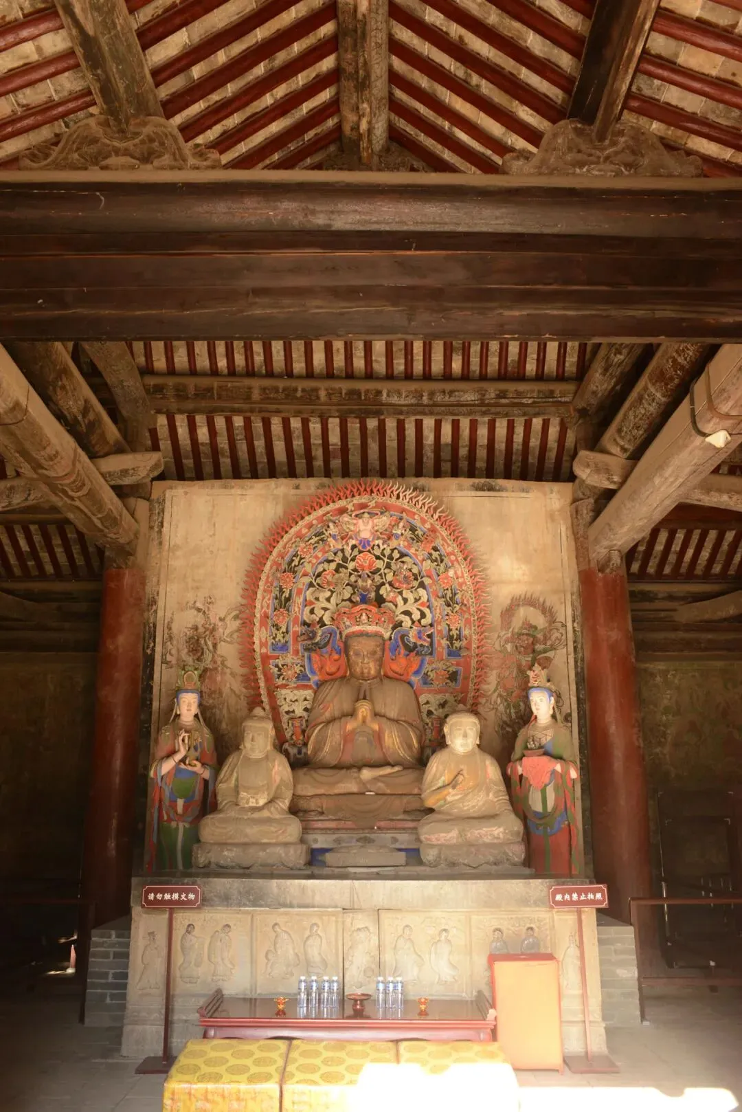 殿内佛坛正中为明代五彩泥塑金身释迦牟尼佛说法像,高3.04米。主尊两侧弟子迦叶、阿难为1987年重塑。