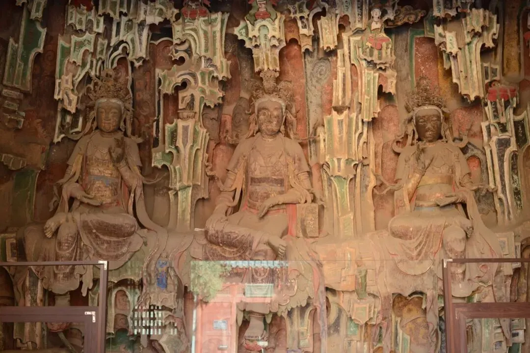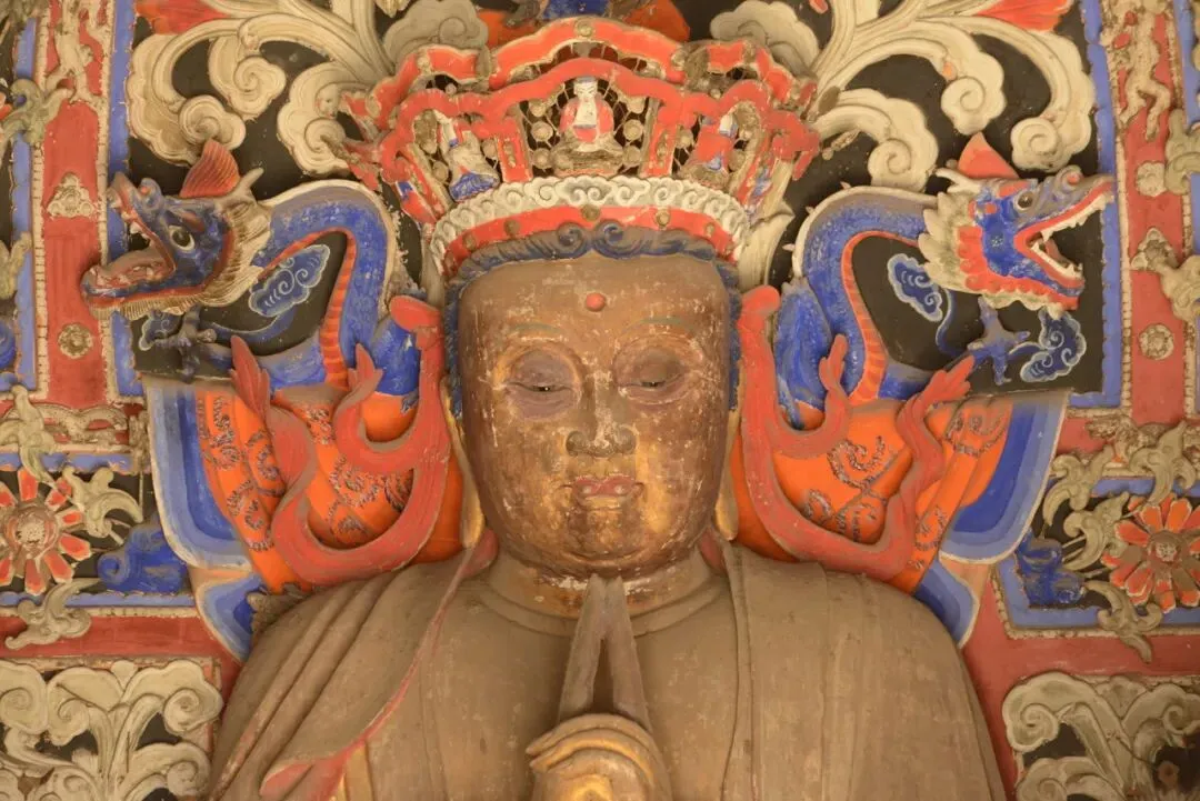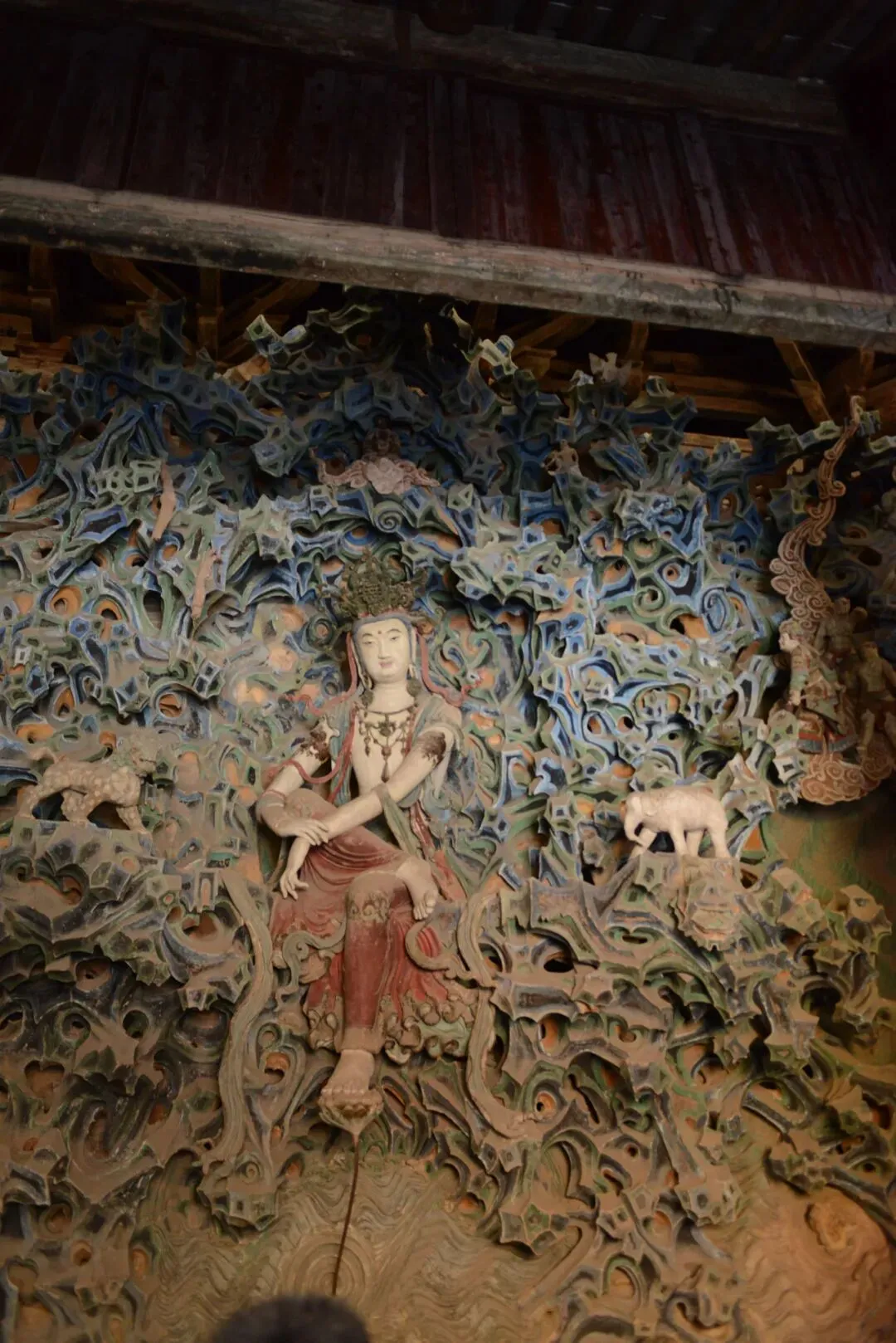 佛龛背面须弥山,亭台楼阁、小桥流水、罗汉护法等悬塑,中间三大士像为明代原塑,正中观世音,左文殊右普贤。