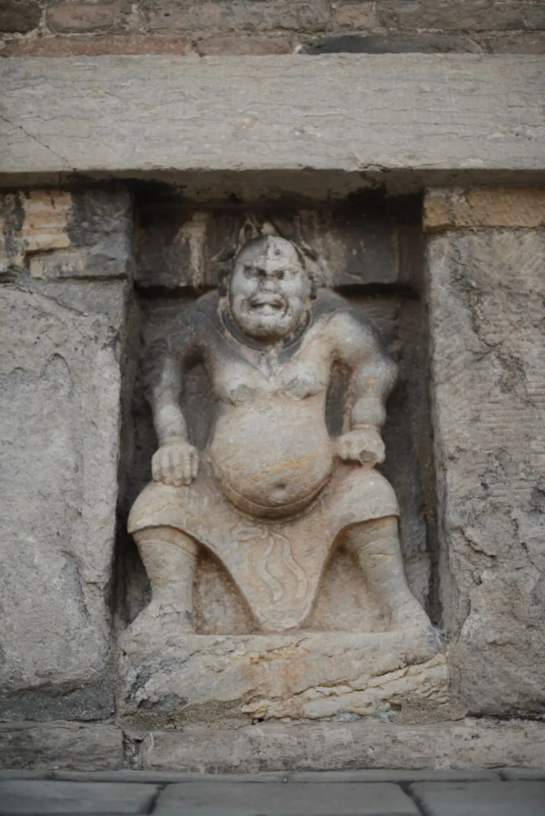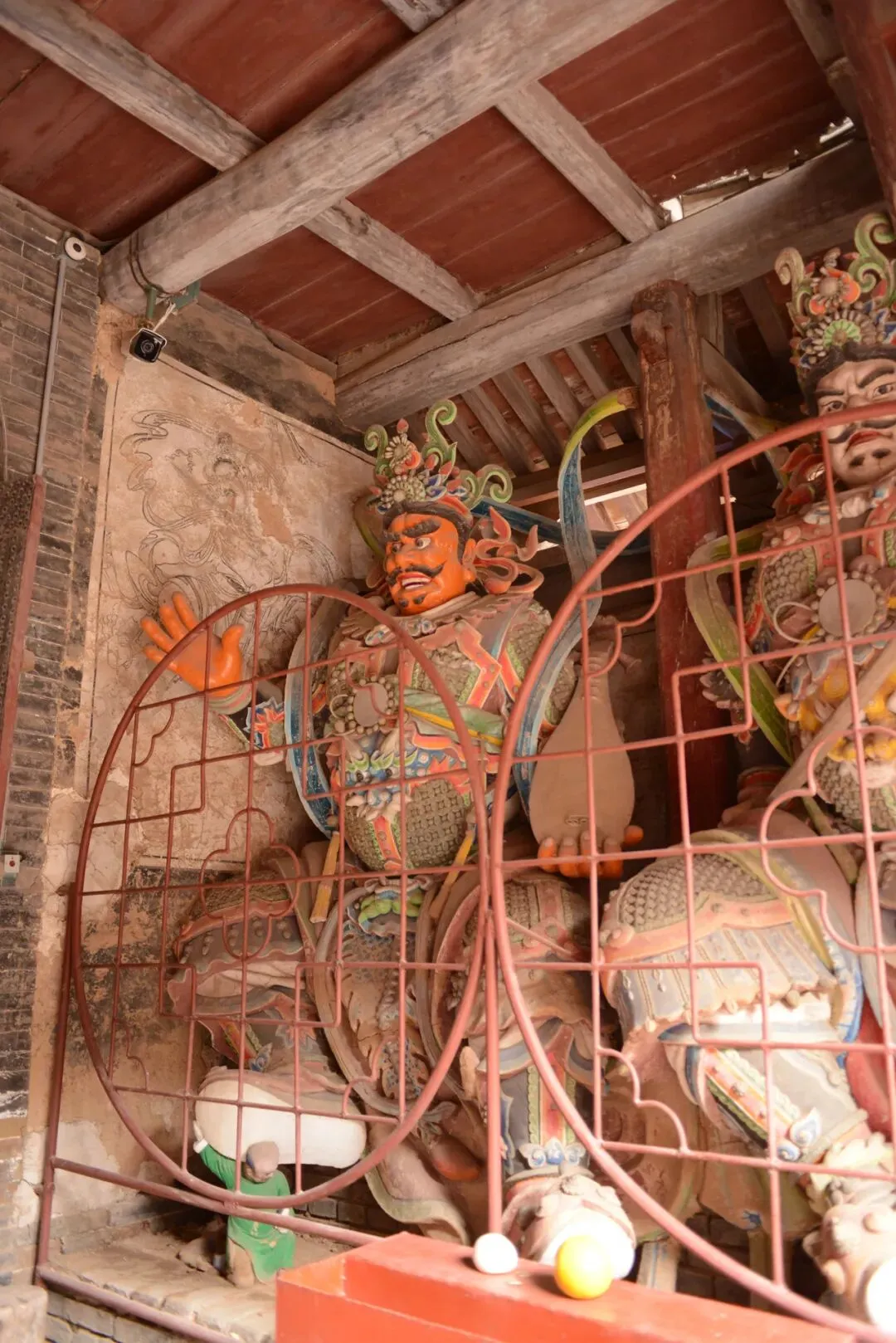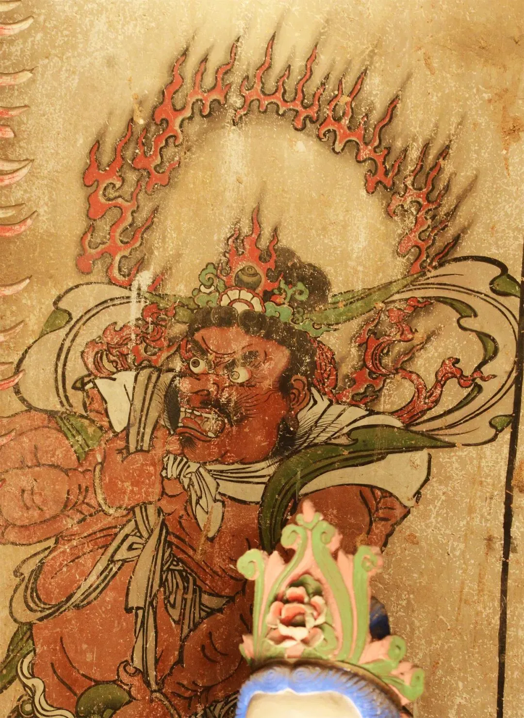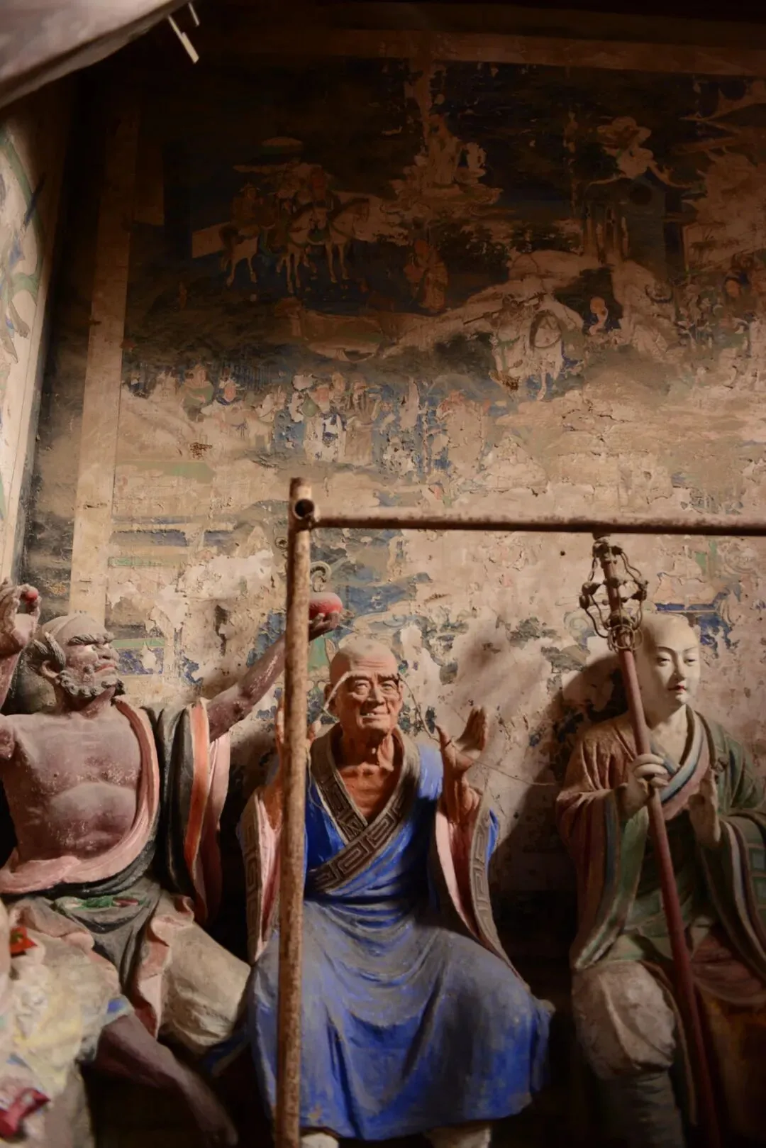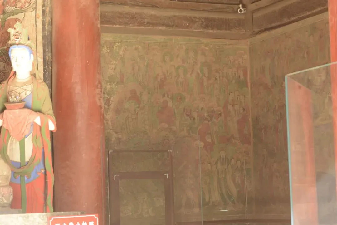 殿内雕像,其中两尊石像为早期原物,而须弥台上的浮雕罗汉,为唐代原物。扇面墙正面二尊护法金刚壁画: