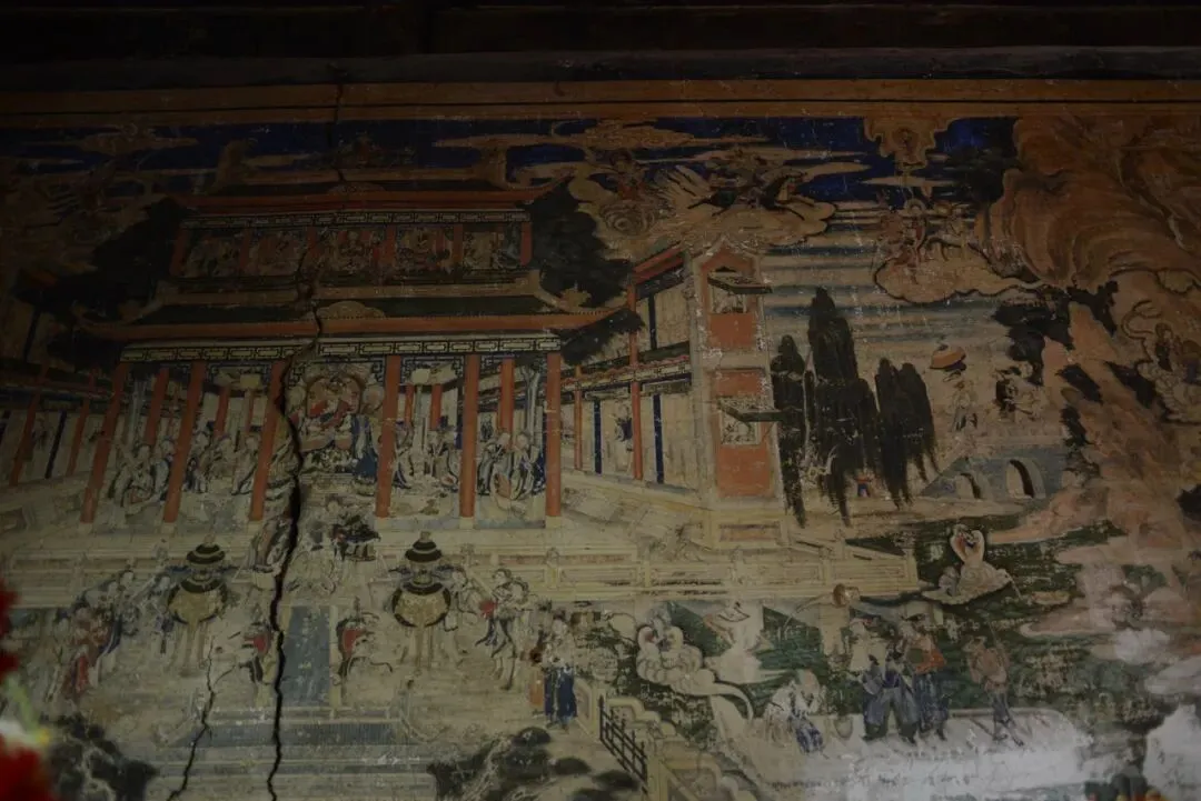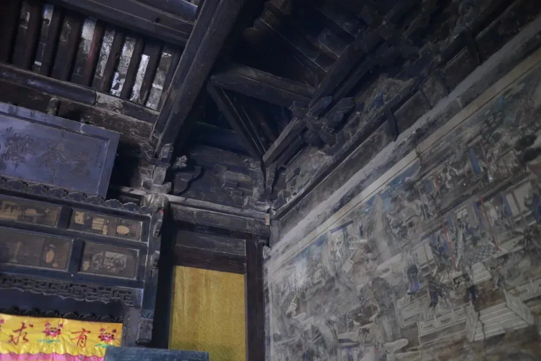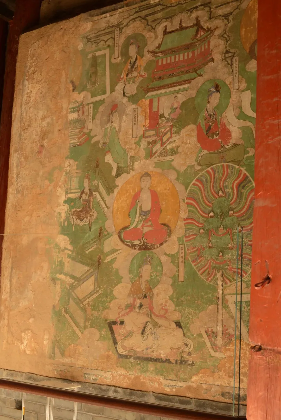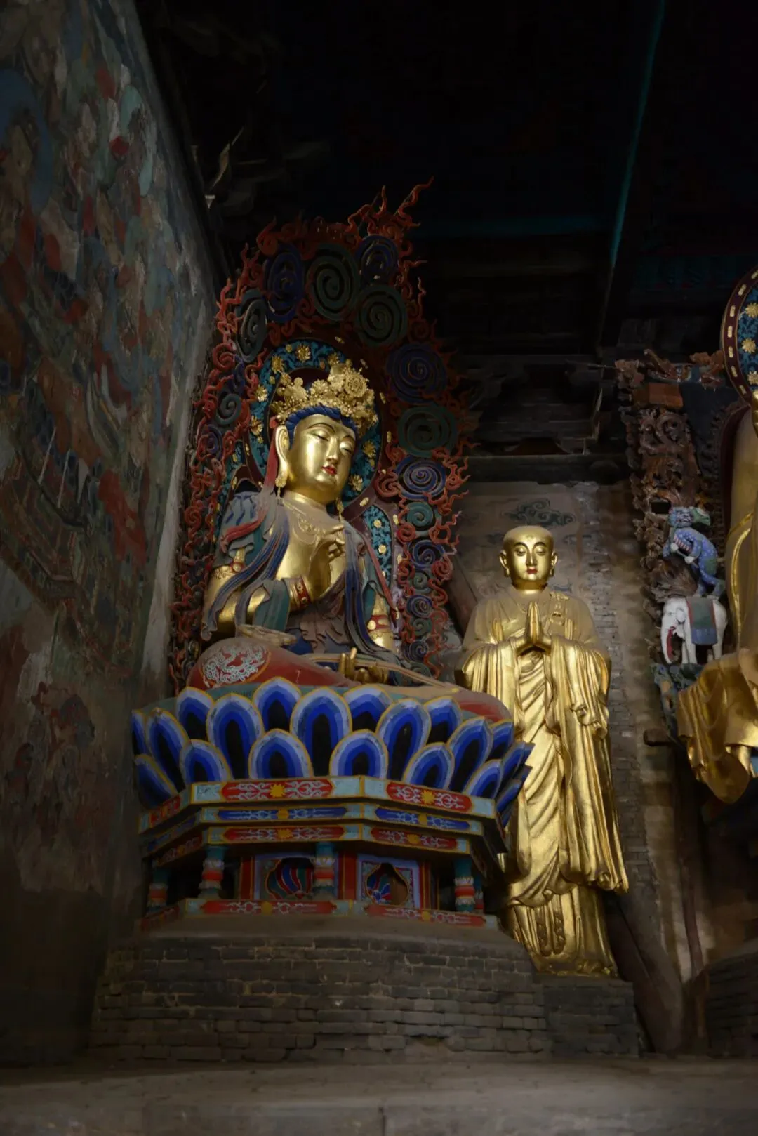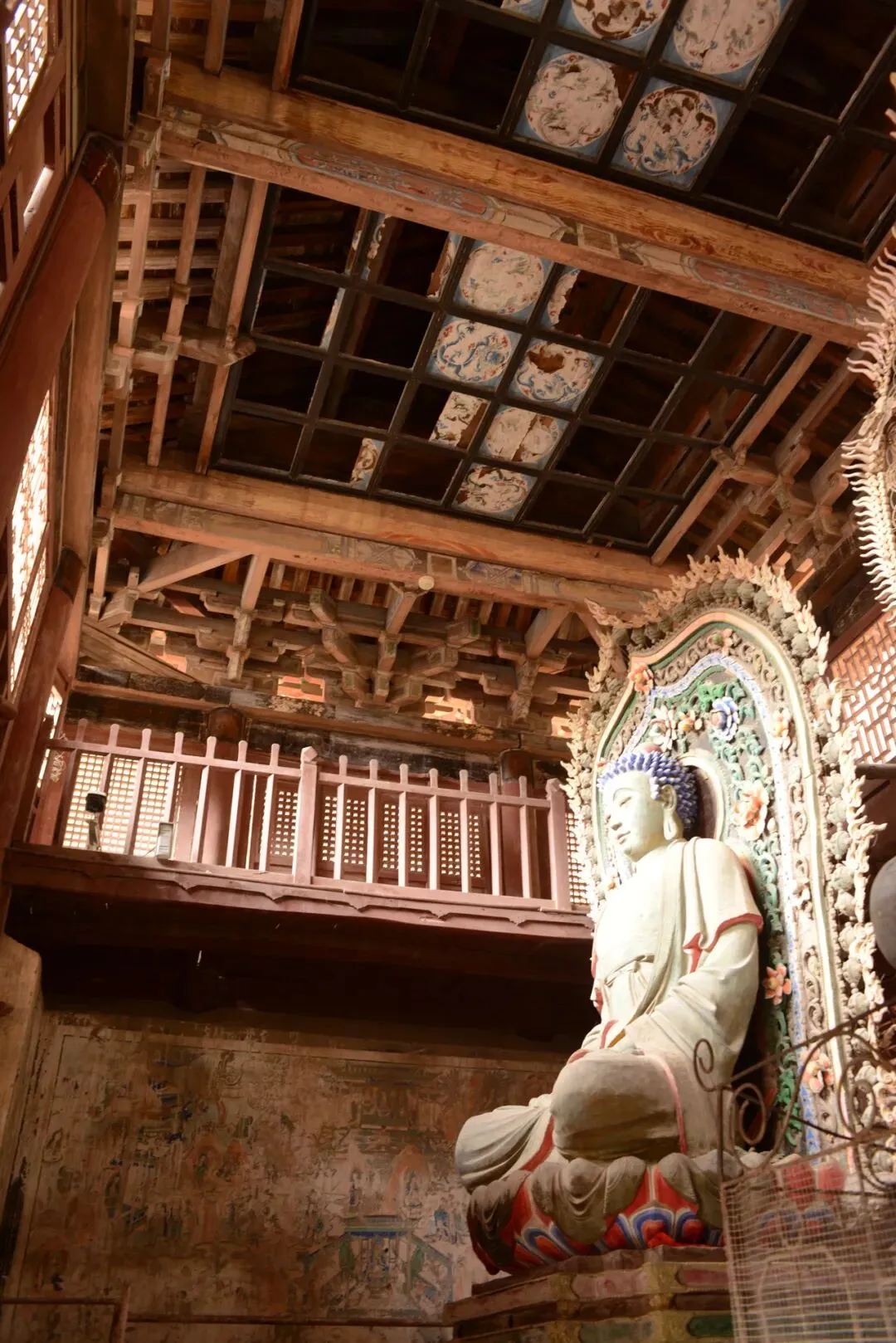释迦殿平面呈凸字。近些年的揭顶大修后,整个建筑已经显得比较新了。殿内的壁画损毁严重,据说以前防水不佳,因此现在在殿周围重新下挖了排水沟。