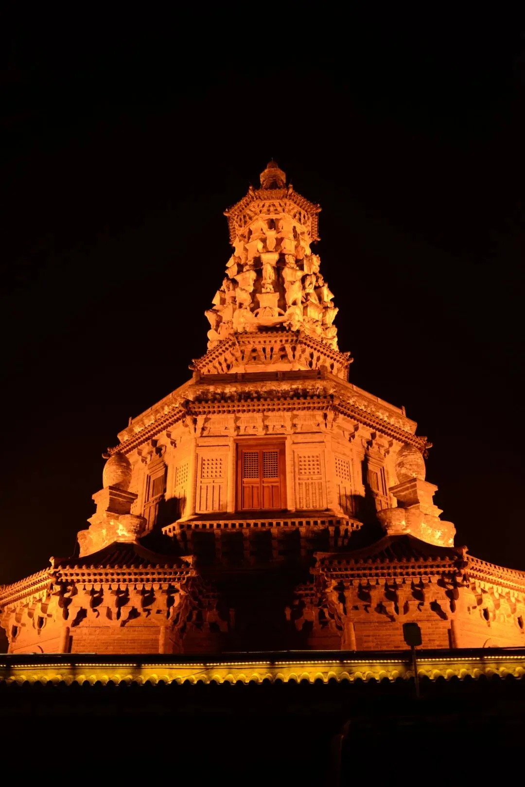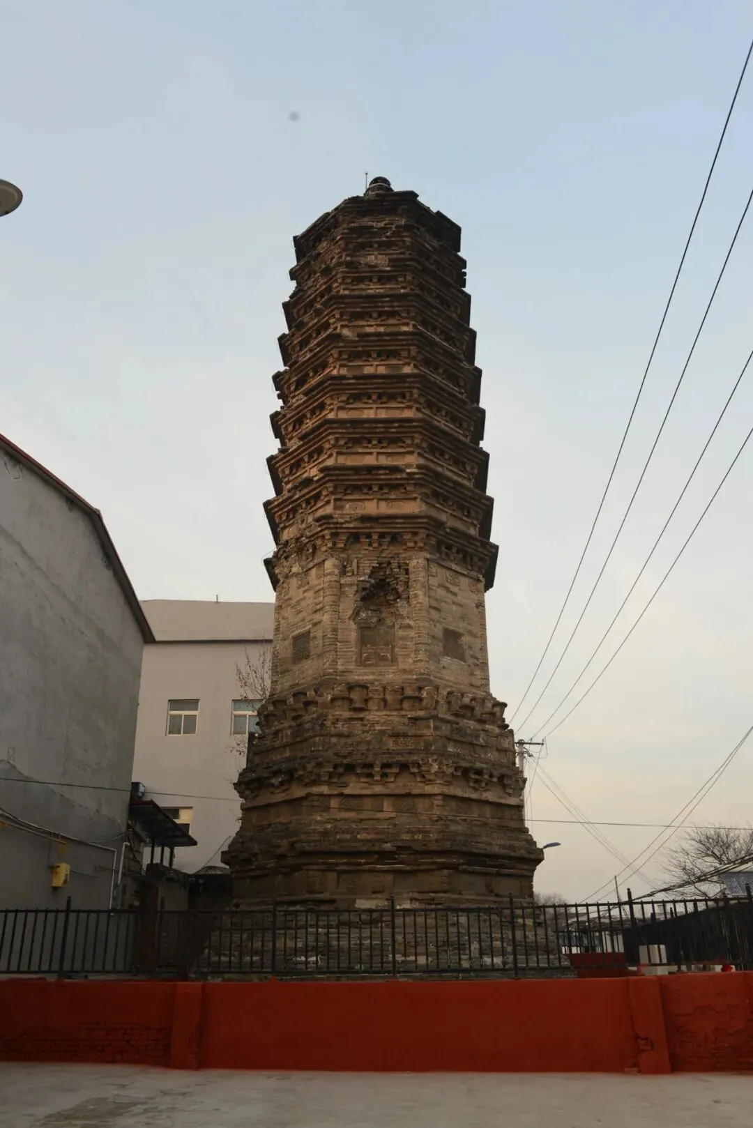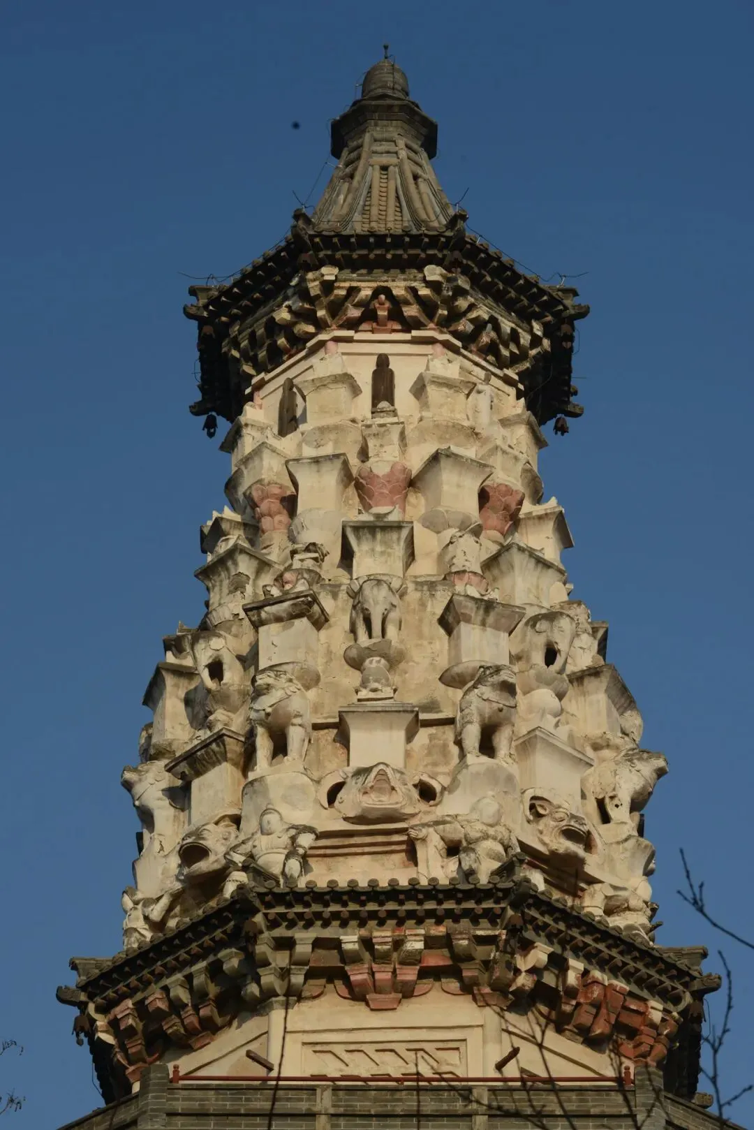 广惠寺华塔又称花塔、多宝塔,主要因为三层以上的八面八角有各种佛像神兽雕塑。始建于唐贞元年间(785-805),金大定、明成化、清乾隆年间均进行过维修。现为宋代遗存。