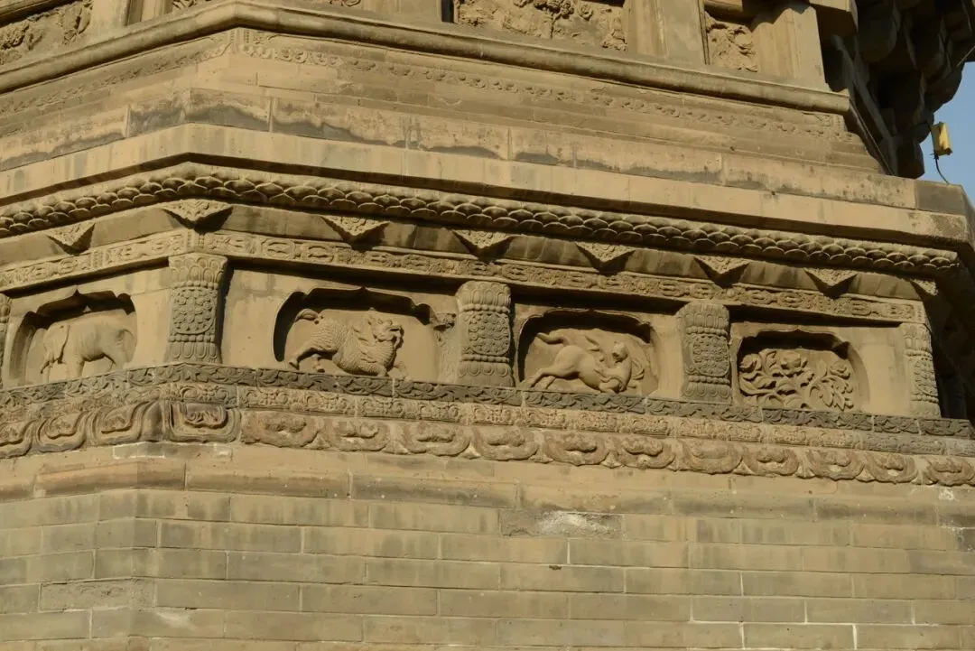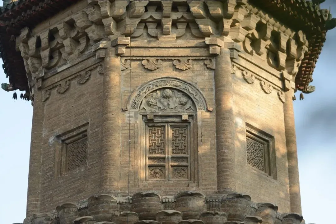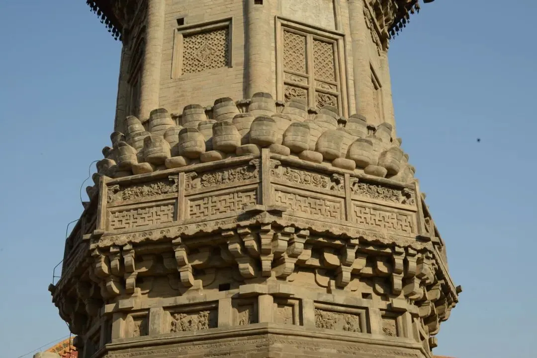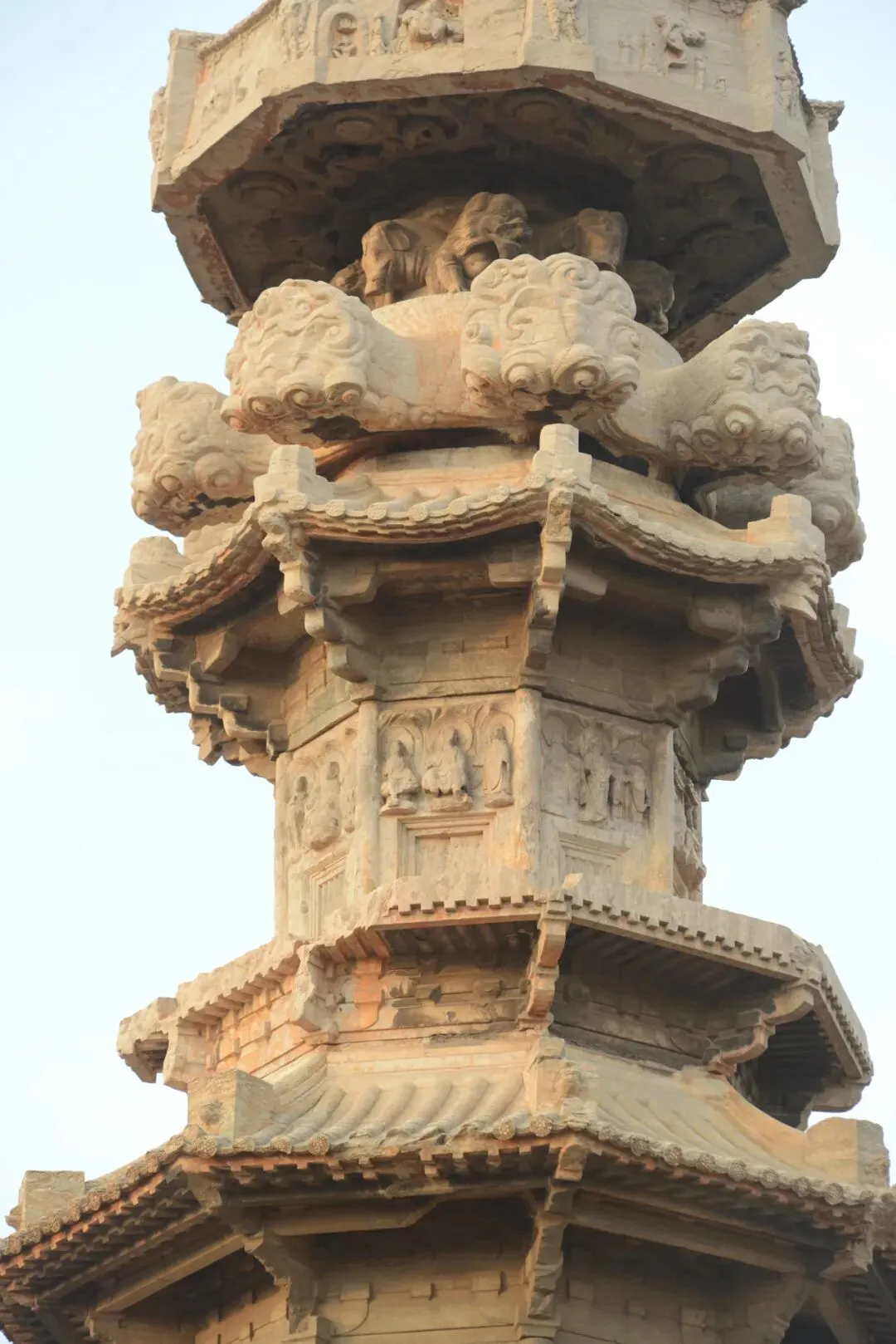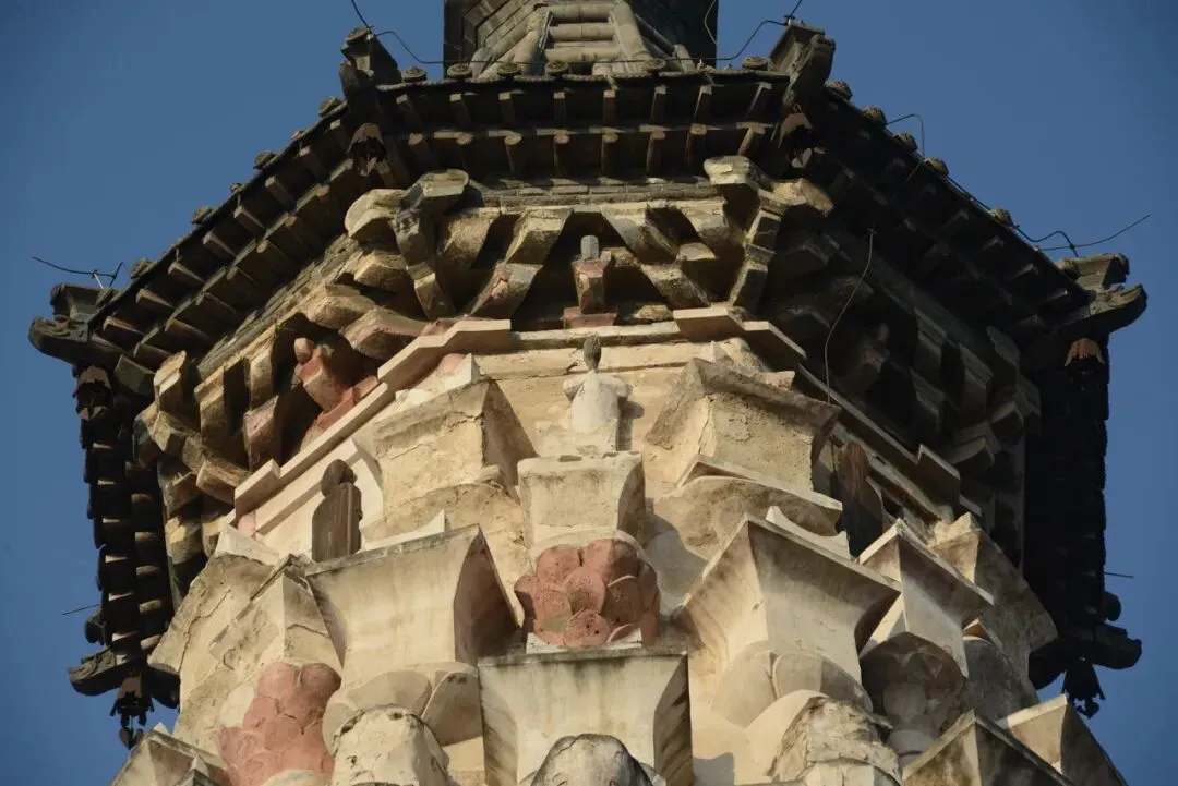 广惠寺华塔又称花塔、多宝塔,主要因为三层以上的八面八角有各种佛像神兽雕塑。始建于唐贞元年间(785-805),金大定、明成化、清乾隆年间均进行过维修。现为宋代遗存。