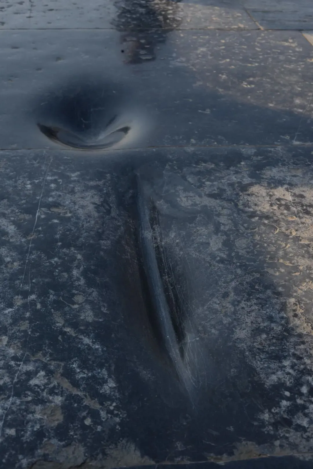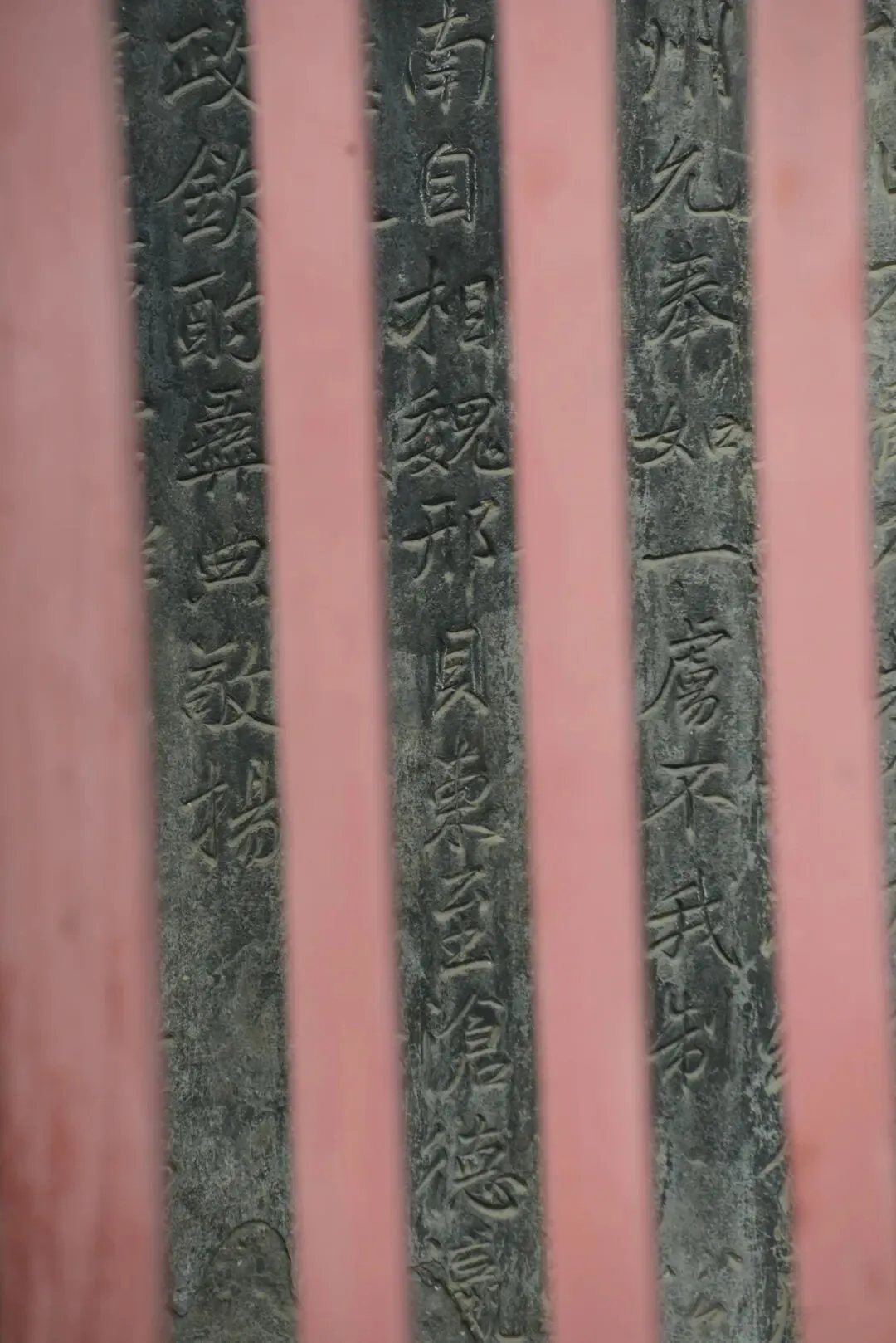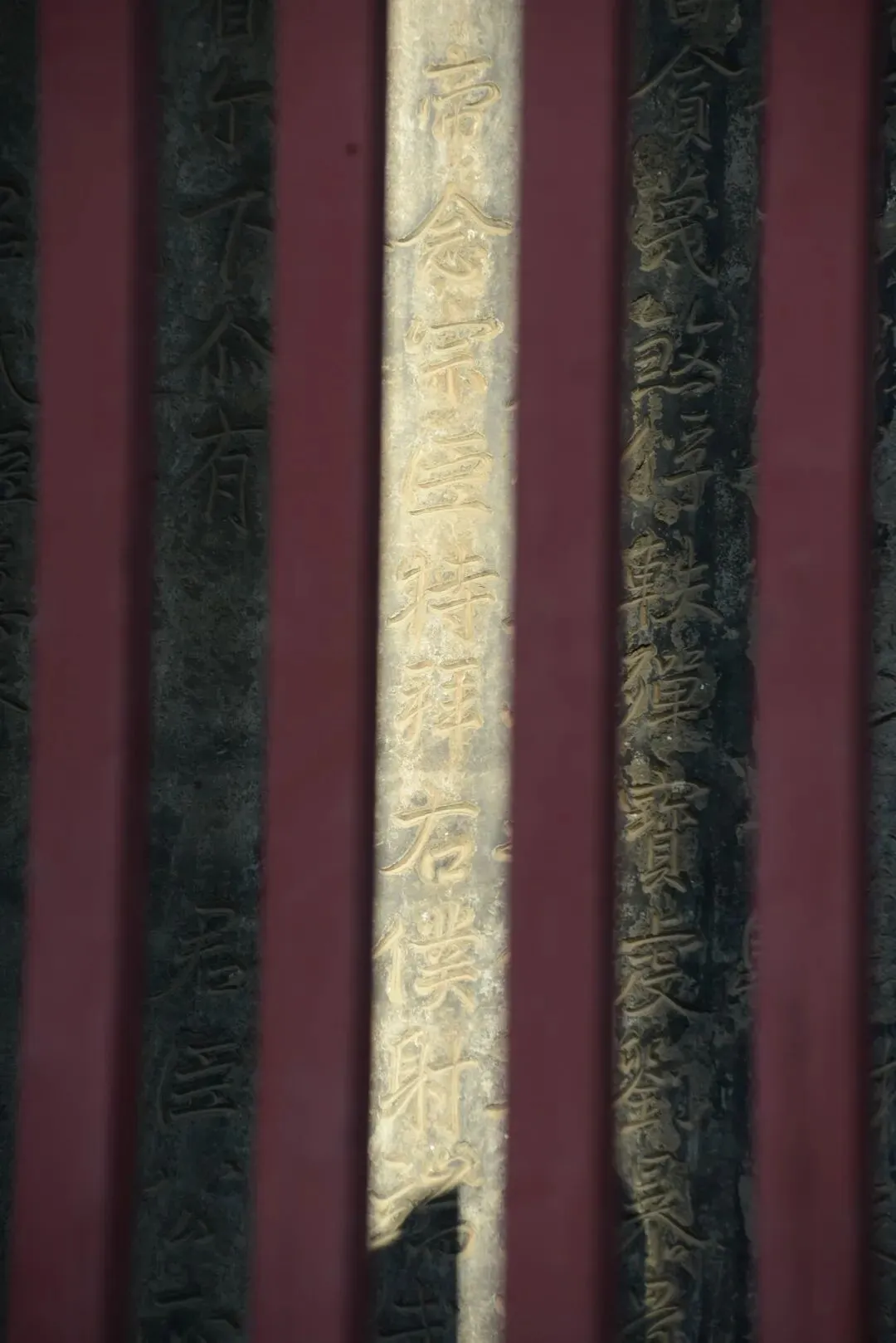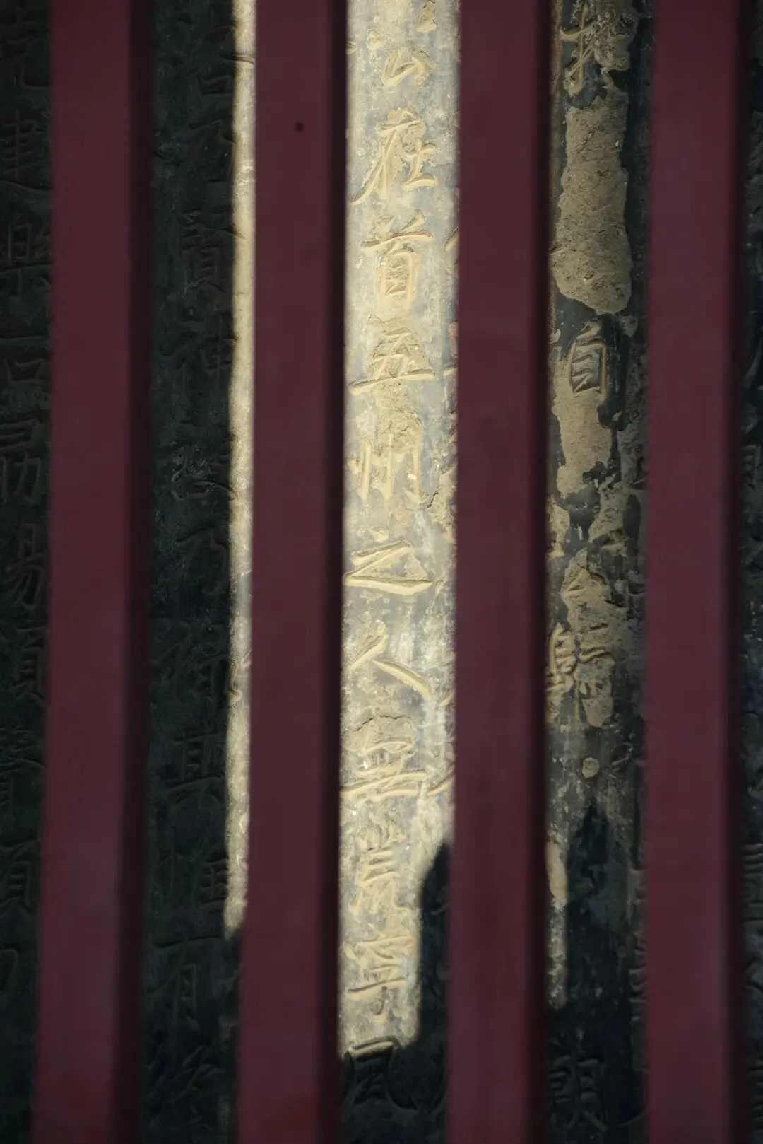 透过阳光,看到字刻得非常漂亮,遒劲雄浑,可惜又是一道一道的铁杆子把碑正面封得严严实实。无语。