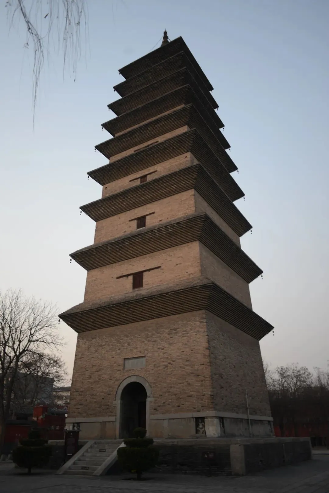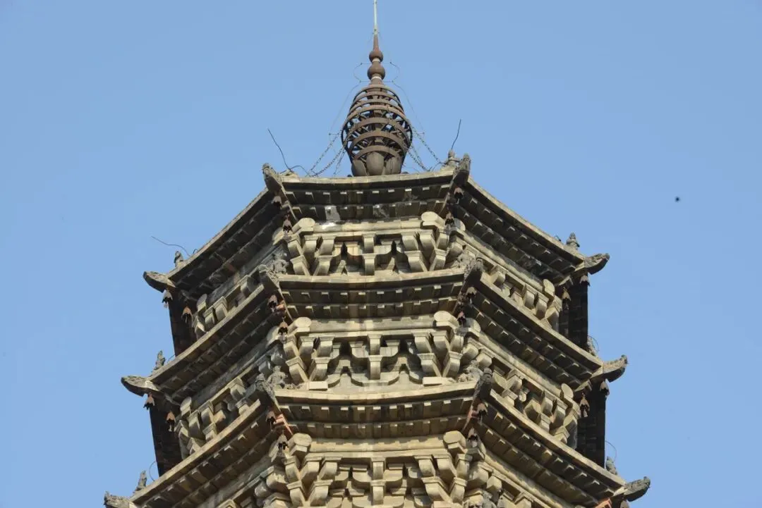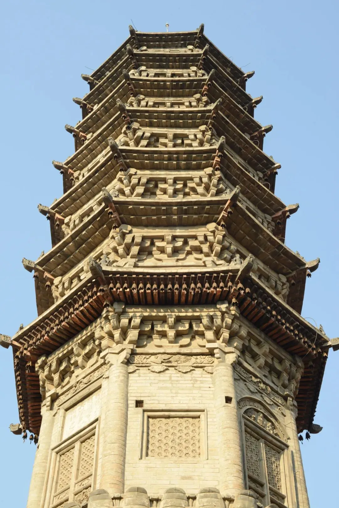 八角九级阁式砖木塔,下三层为砖结构,四层以上斗拱及各层檐为木制。通高40.98米。塔内中空,原本有阶梯上,目前不开。塔心内第四层开始,立木质中心柱。地宫出土各类文物。