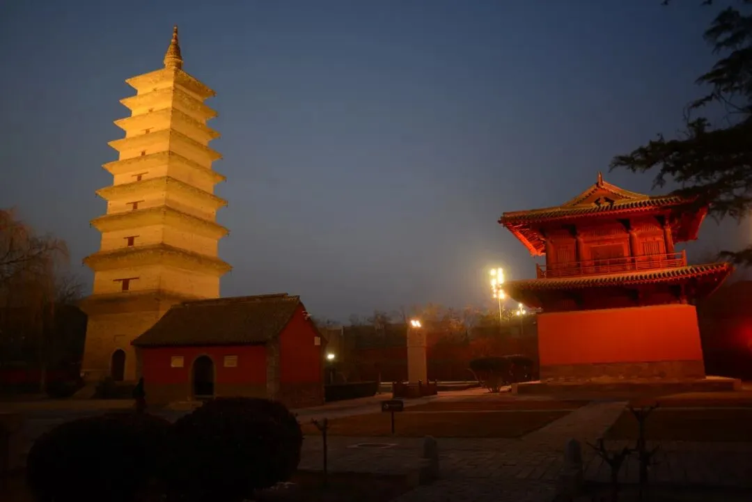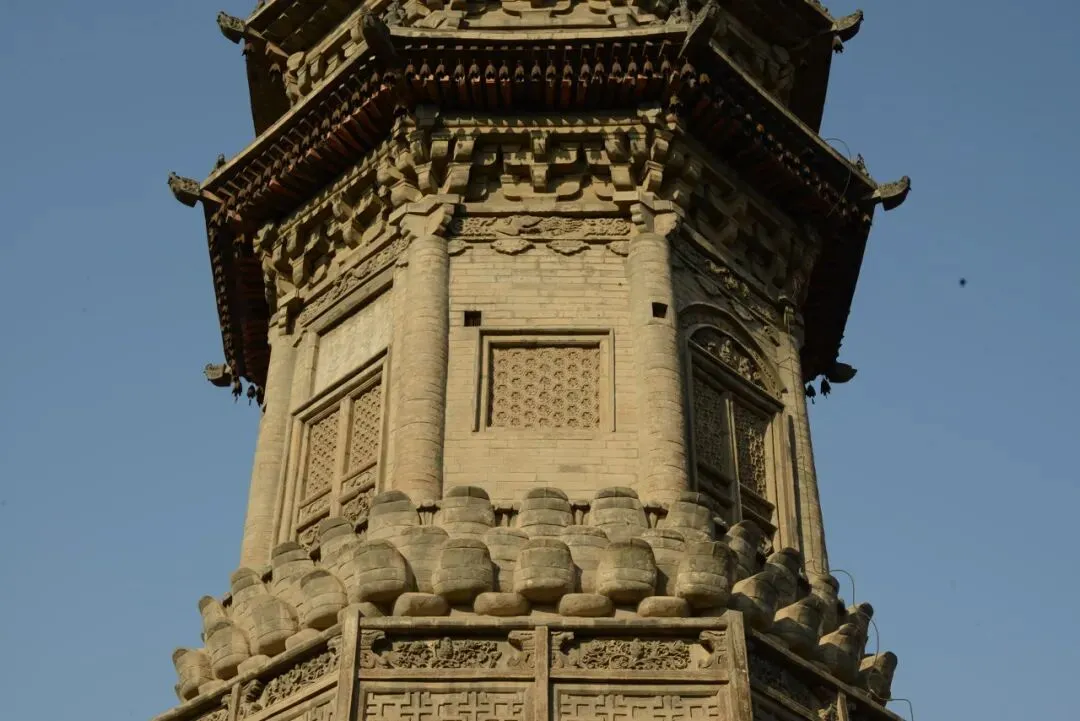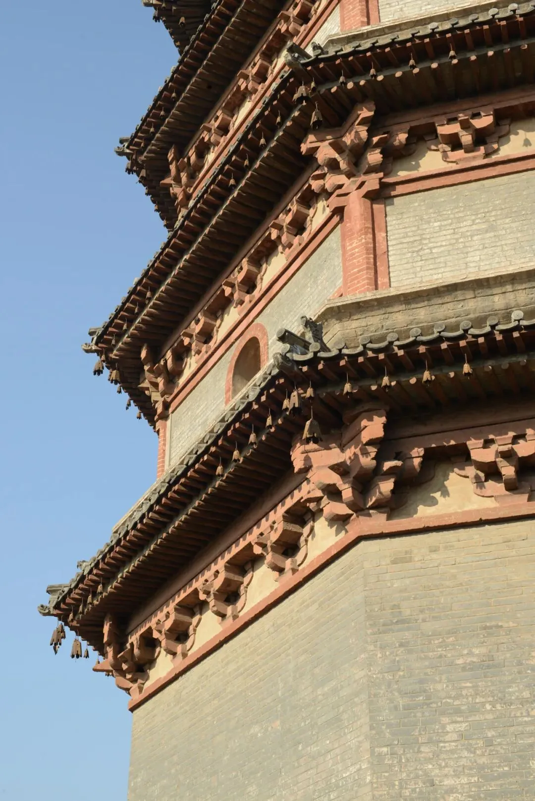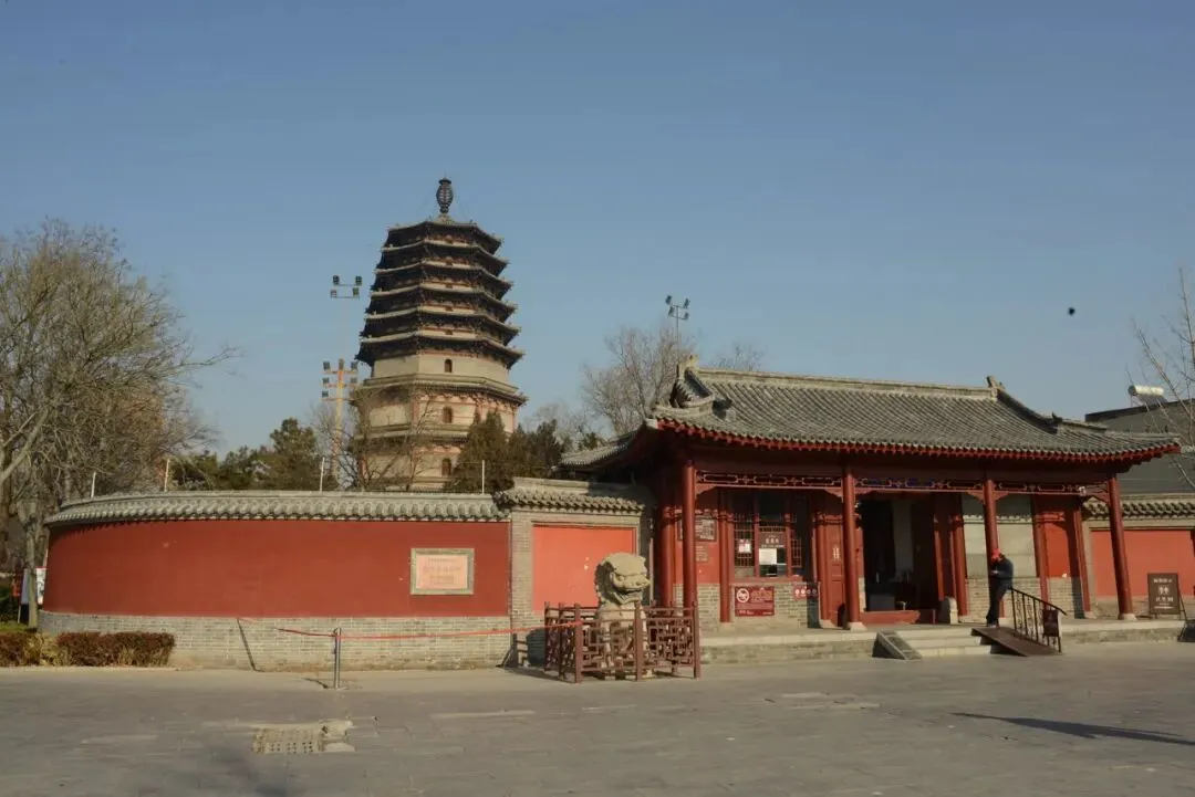 八角九级阁式砖木塔,下三层为砖结构,四层以上斗拱及各层檐为木制。通高40.98米。塔内中空,原本有阶梯上,目前不开。塔心内第四层开始,立木质中心柱。地宫出土各类文物。